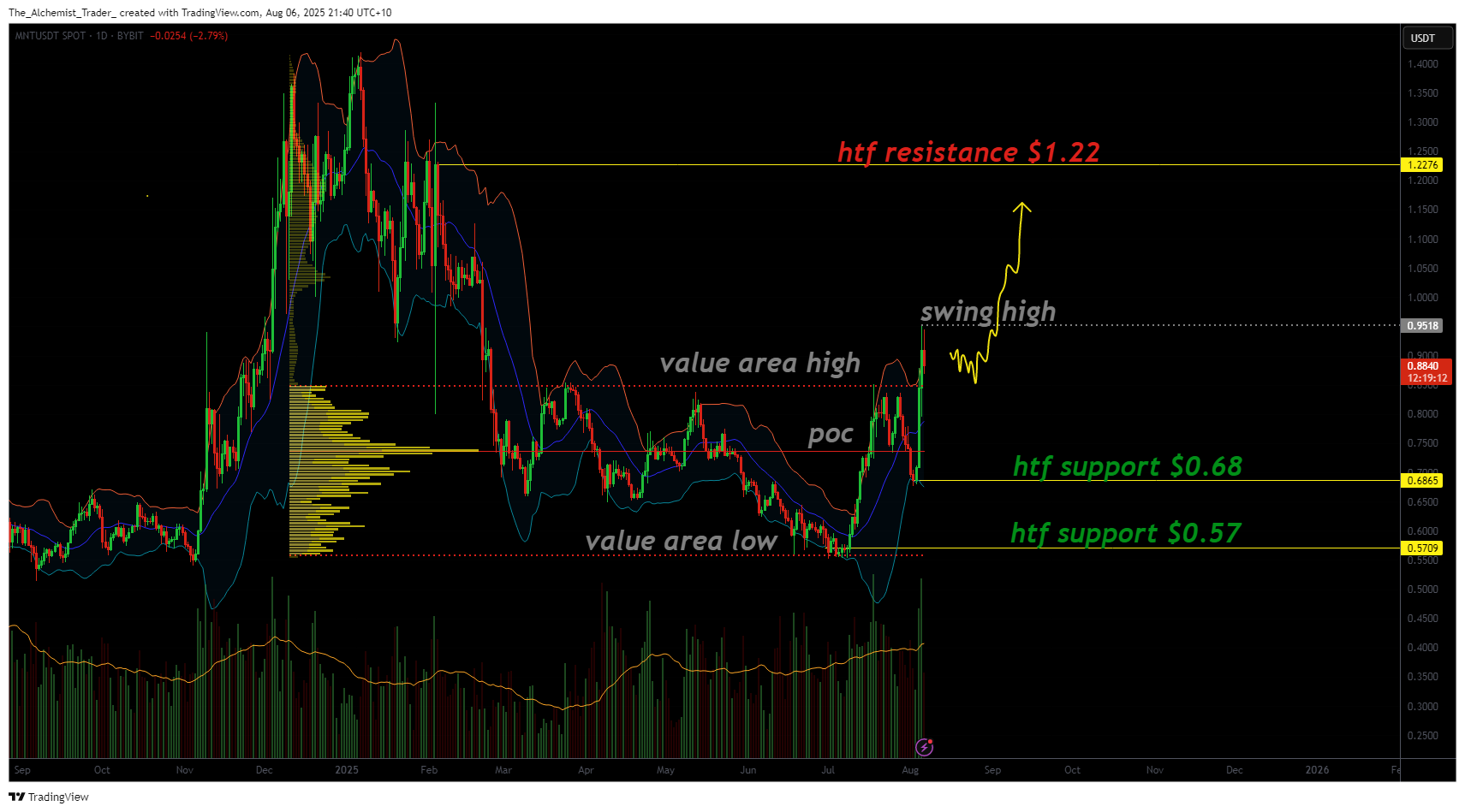The recent 20% move in MNT represents a significant shift in sentiment and momentum. From a structural perspective, the bullish trend began when the value area low at $0.57 held firm on multiple high time frame retests. This support zone acted as a base for accumulation, setting the stage for the current leg higher.