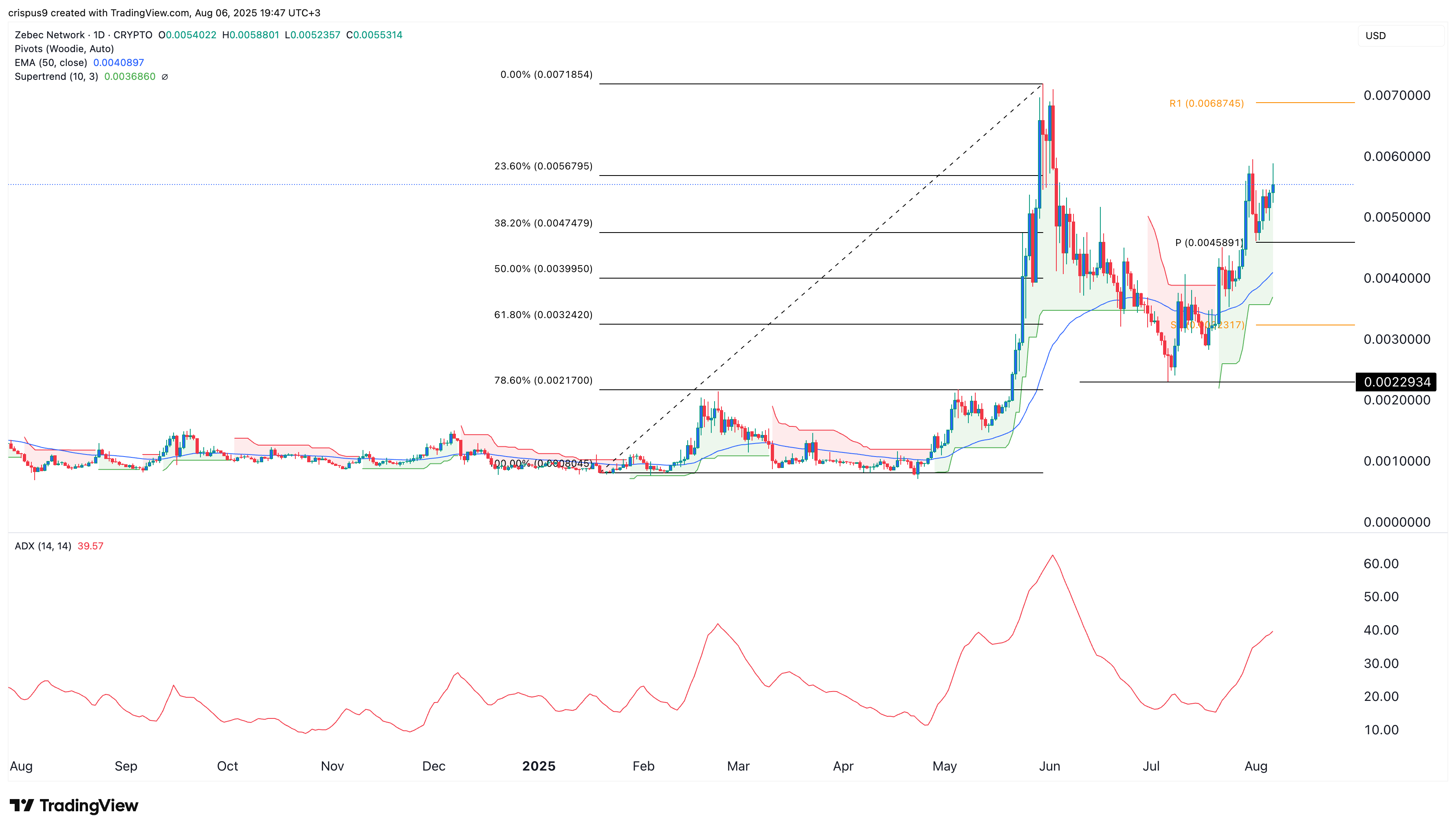 The daily timeframe chart shows Zebec Network has been in strong upward momentum after bottoming at $0.00229.