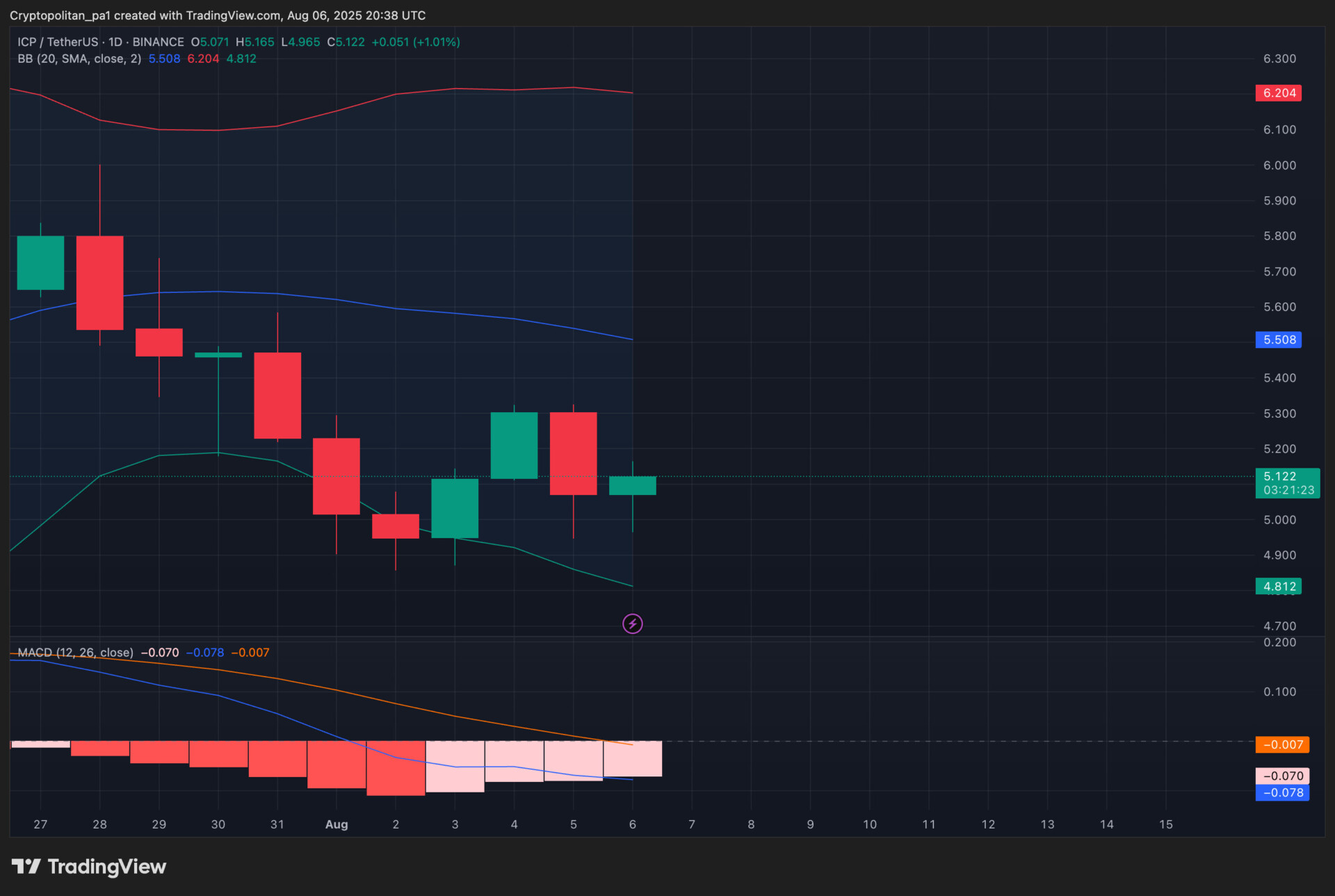 The daily chart for August 6 shows ICP trading at $5.122 with a modest +1.48% gain, yet with concerning underlying weakness. The price action remains trapped within the Bollinger Bands, with the upper band at $6.204 acting as strong resistance and the lower band at $4.812 providing support.