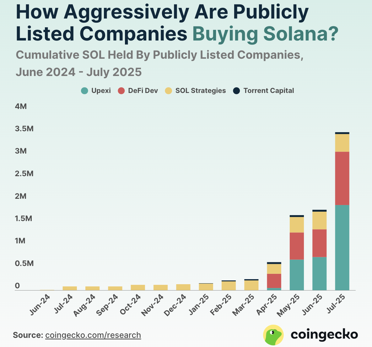 CoinGecko released a report on Solana treasury firms, yielding several important insights. The sector is much less crowded than corporate Bitcoin and Ethereum investors, but interest is rapidly growing.