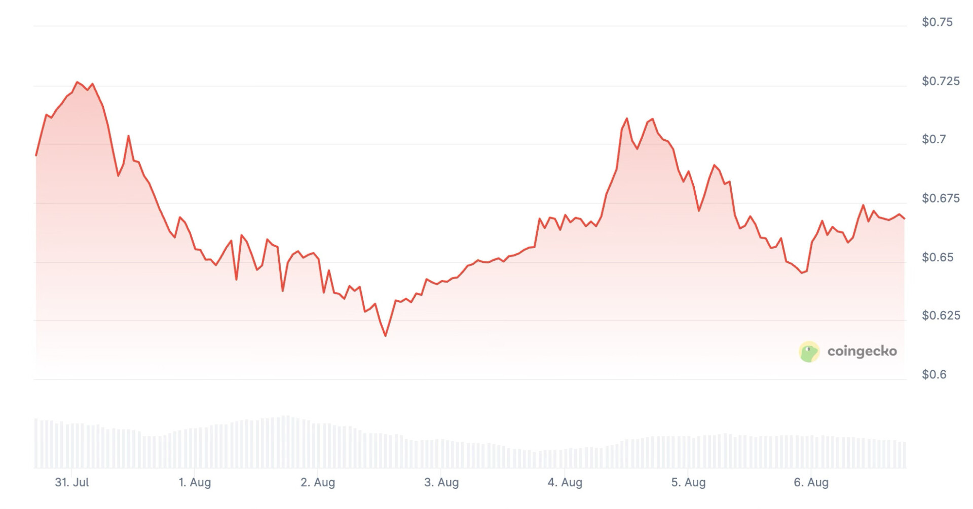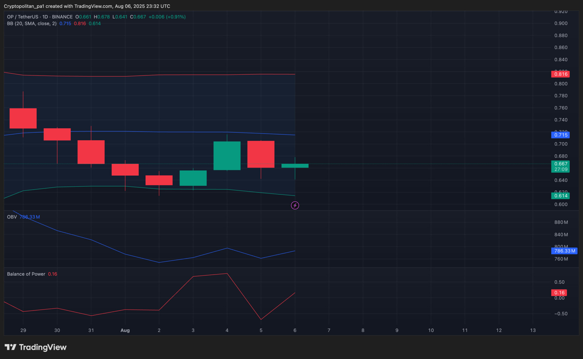 As of August 6, 2025, OP is trading at $0.667 with a modest +0.91% gain, demonstrating resilience after experiencing significant volatility in recent sessions. The daily chart reveals price action oscillating within a defined range, with the middle Bollinger bands currently positioned around $0.715 at the upper boundary and $0.614 at the lower boundary.