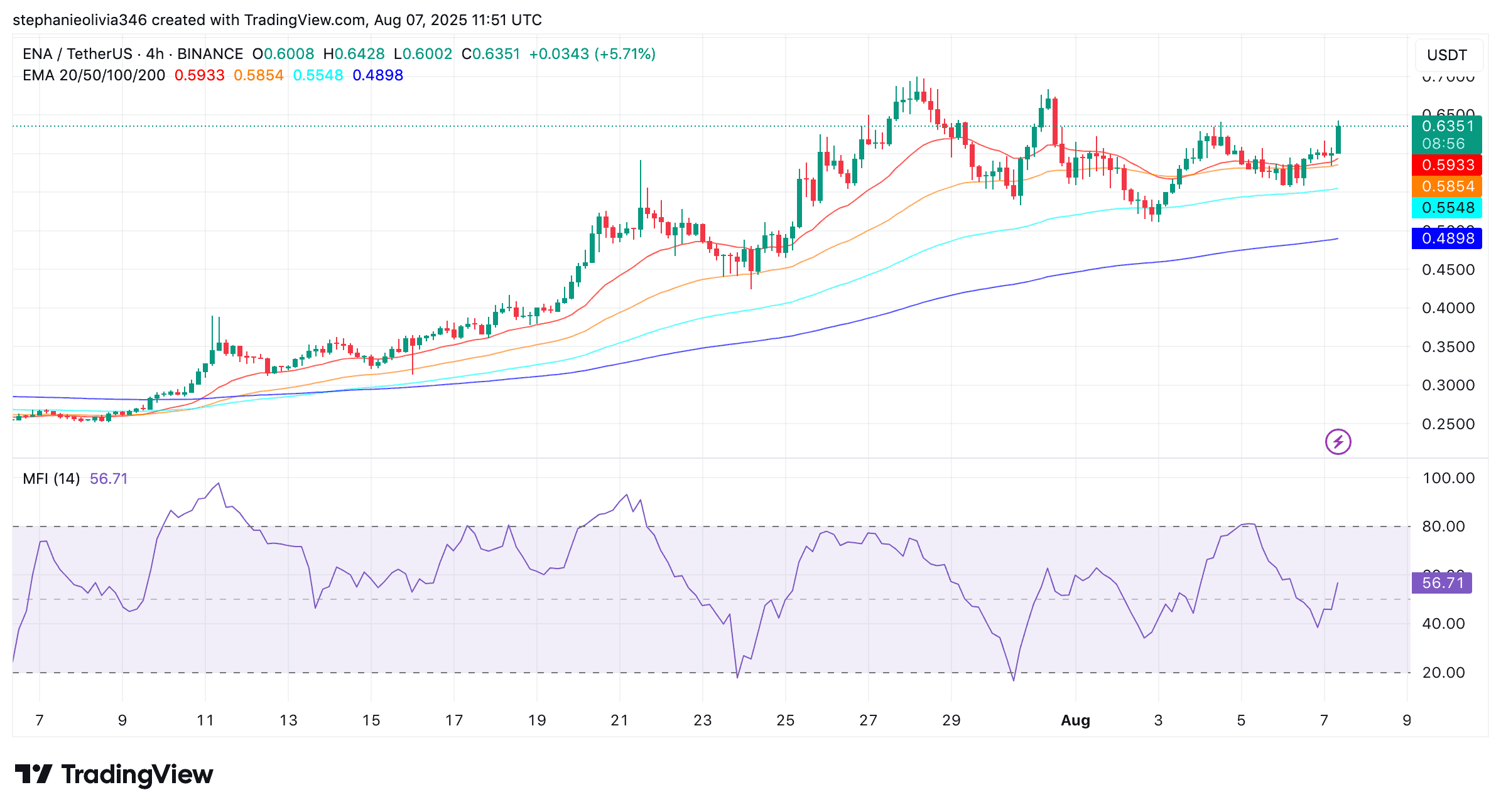On the 4-hour chart, ENA trades above the 20, 50, 100, and 200-period exponential moving averages (EMAs). These are aligned in bullish order, with the current price sitting well above the 200 EMA near $0.49. This pattern often suggests a continuation in the current trend.