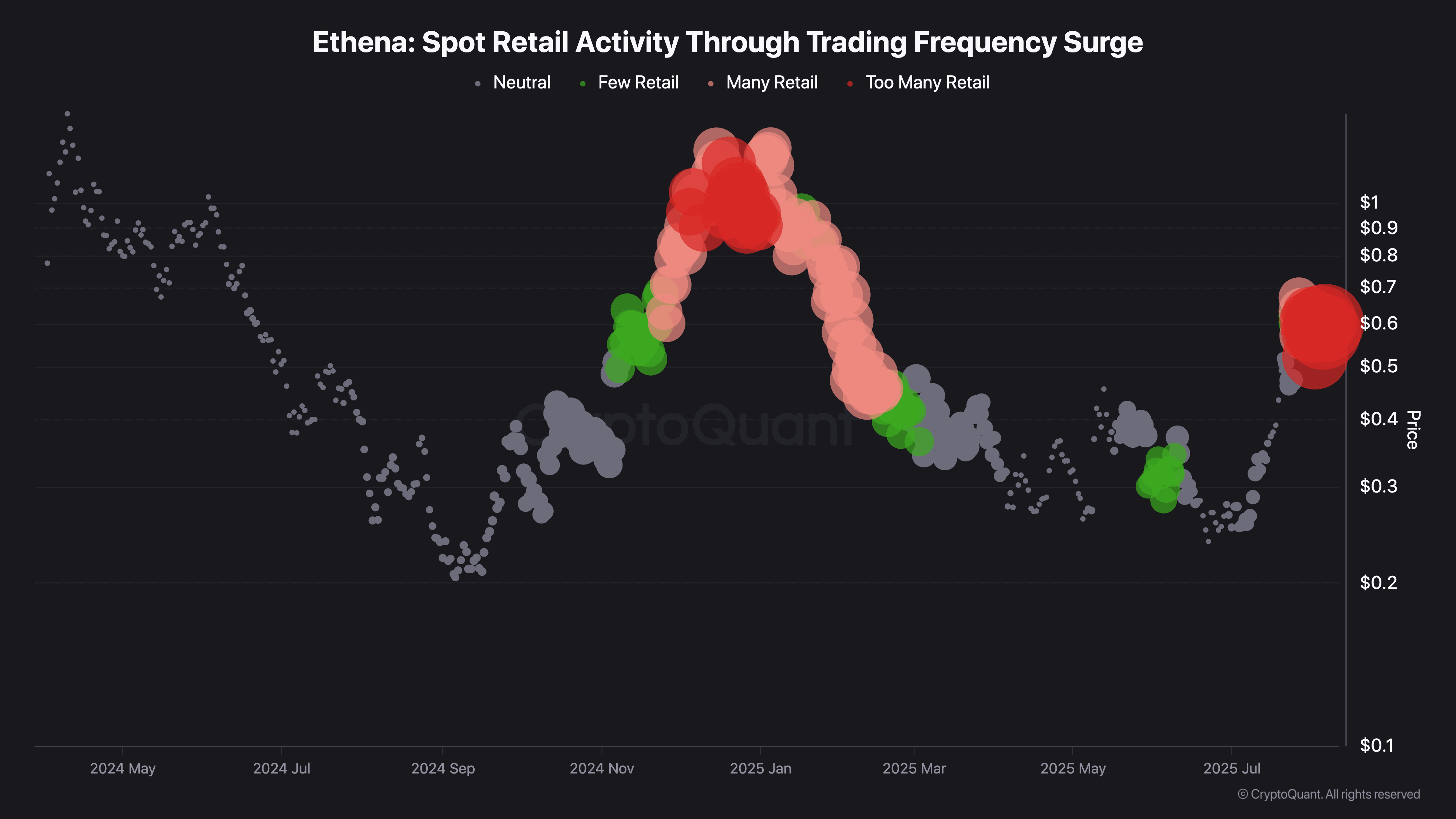 Data from CryptoQuant shows retail activity has increased sharply. The latest readings in the $0.60 to $0.70 range are marked red, labeled as “Too Many Retail,” a sign of heavier participation by smaller traders. Similar past clusters have often appeared near local peaks.