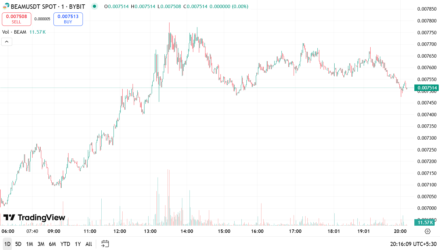 One token catching serious attention in this rally is BEAM, which has jumped nearly 14% in the past 24 hours and is up 25% over the last month. Currently trading around $0.00757, BEAM touched a 24-hour high of $0.00773 before pulling back slightly.