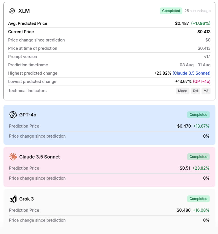 Following the news, to set a Stellar price target for August 31, Finbold’s AI prediction agent used multiple LLMs to generate an average forecast for improved accuracy while incorporating momentum-based indicators into its context. You can experiment with the existing prompts or create your own. Try here now.