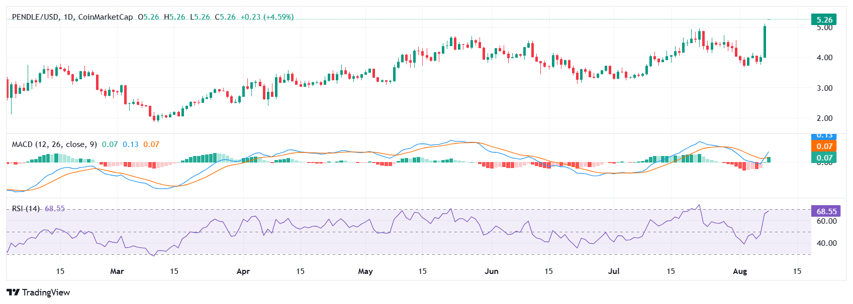 On the other hand, there were also notable major wallet movements. Pendle’s multisig wallet sent 900,000 PENDLE worth $4.65 million to Binance after the price surge. However, this wallet still holds $135 million worth of PENDLE, indicating long-term confidence. Technically, PENDLE has broken through the $5.25 resistance that previously acted as a barrier in July and is now testing it again as support.