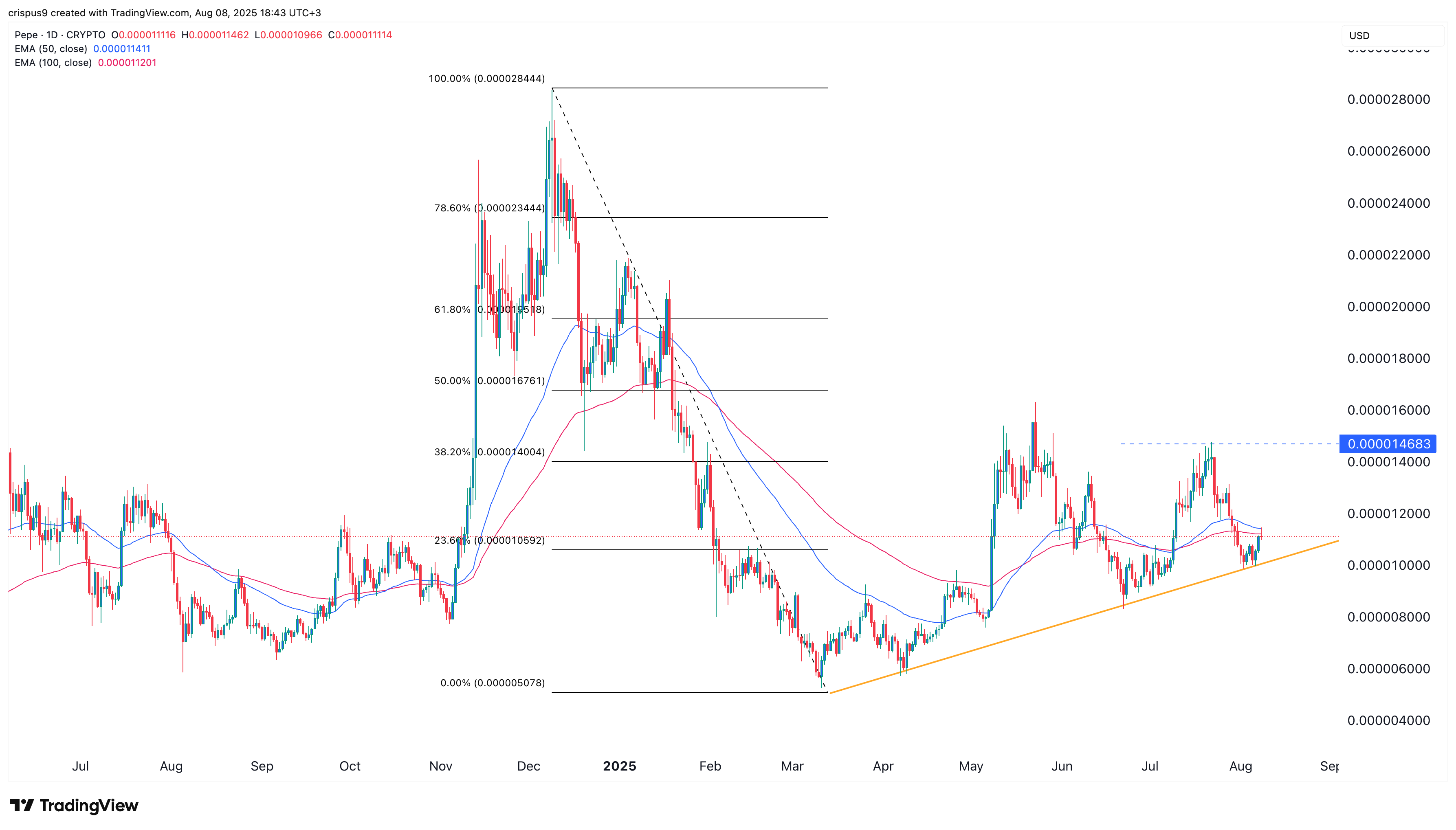 Pepe has climbed above the 23.6% Fibonacci retracement level at $0.00001060 and is attempting to reclaim the 50-day moving average. It has also respected a rising trendline support.