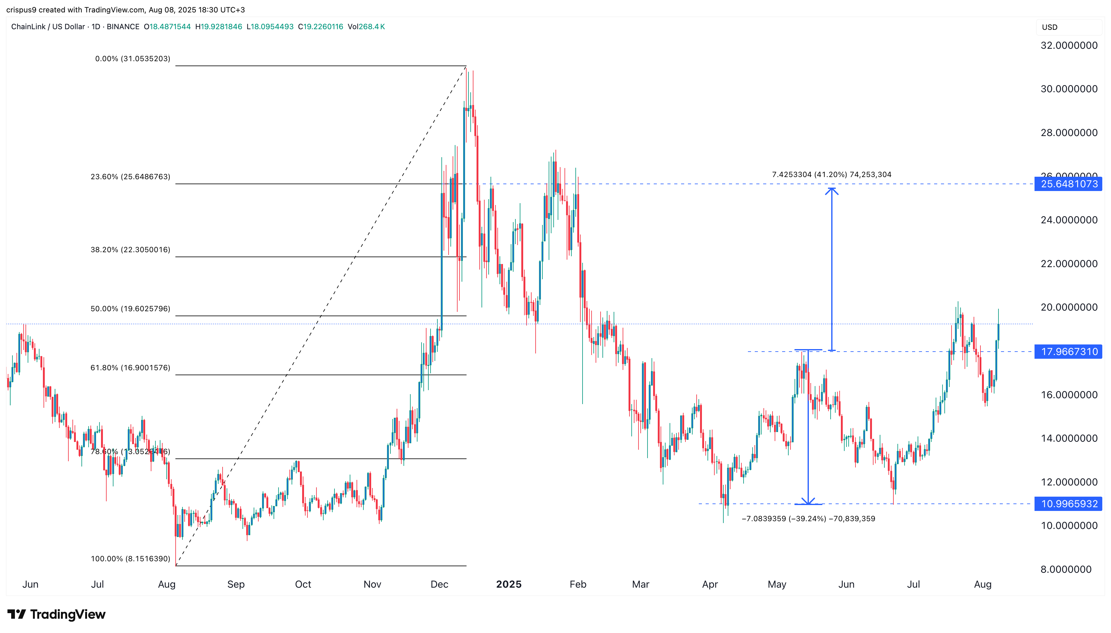 This wave could take LINK to $25.65, which aligns with the 23.6% Fibonacci retracement level. That price target also aligns with the double-bottom measurement, calculated by projecting the height from the neckline.