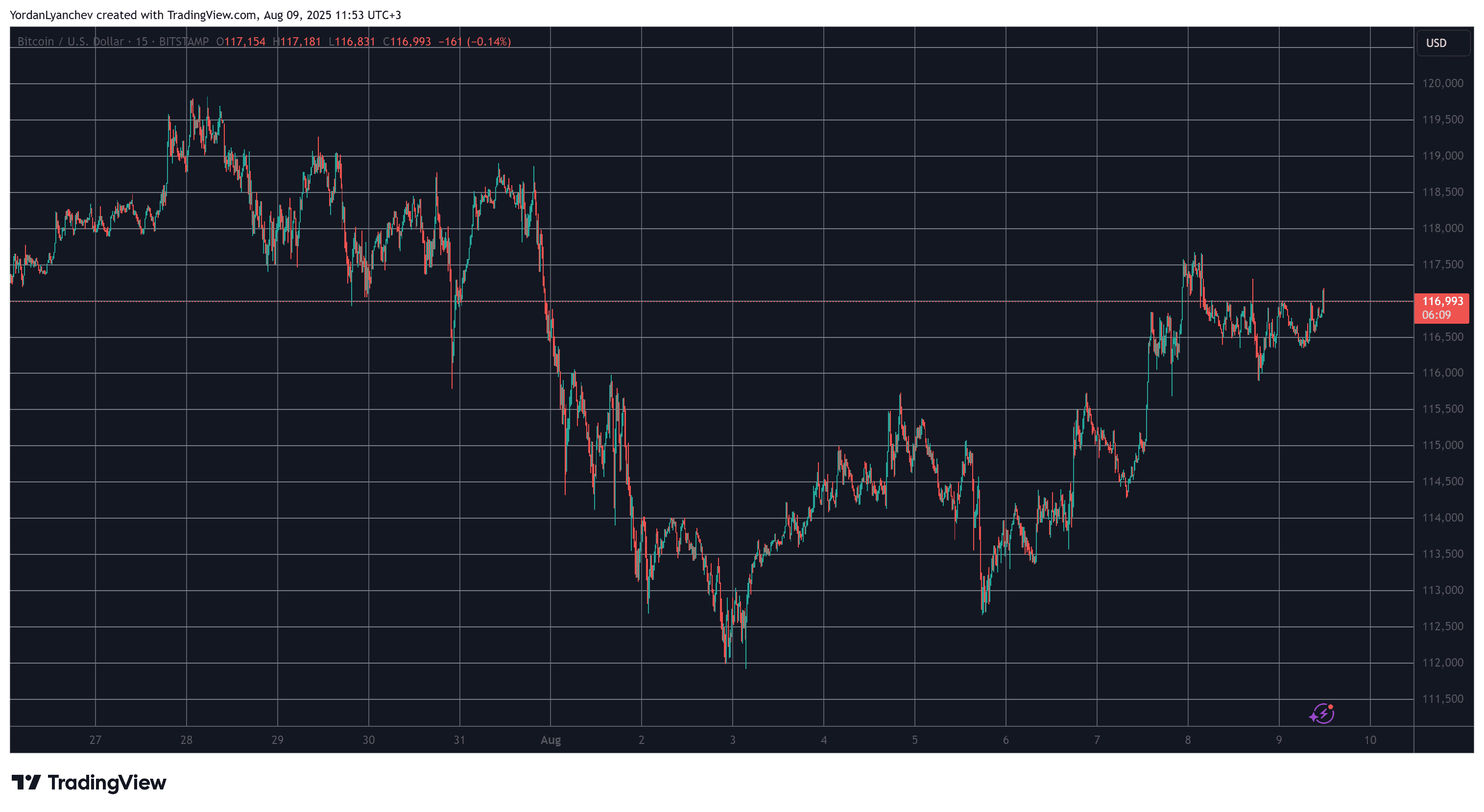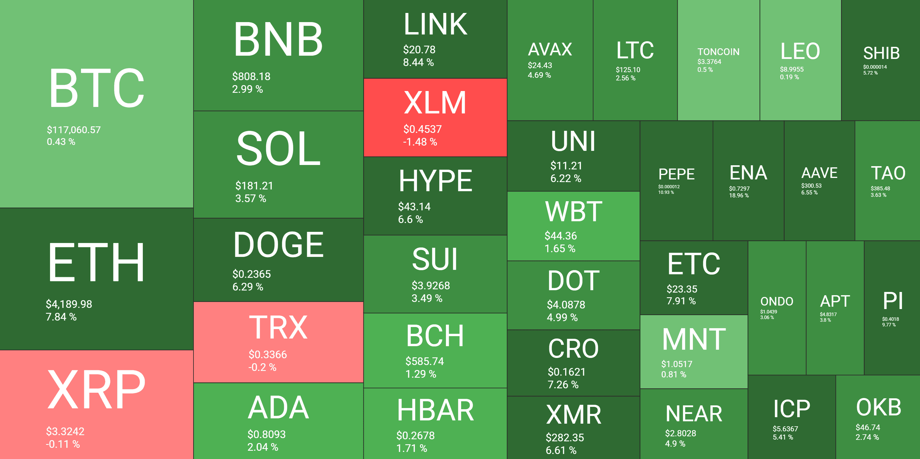 Bitcoin’s price gained a few grand over the past days but was stopped ahead of $118,000 and now stands around $117,000.
