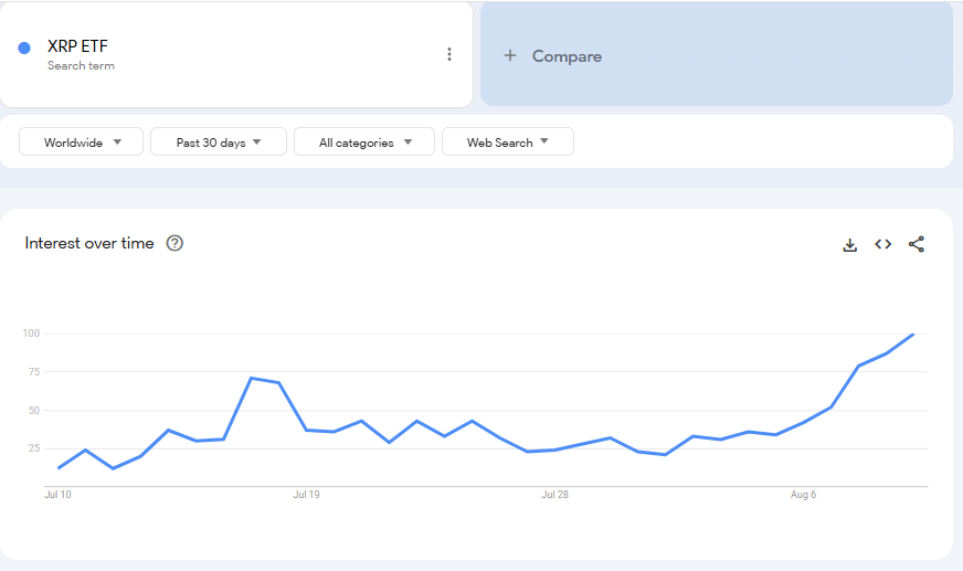 According to Google Trends, searches for ‘XRP ETF’ rose from a score of 12 on July 10 to 100 on August 10, marking the highest level of interest in the last 30 days, according to data retrieved by Finbold.