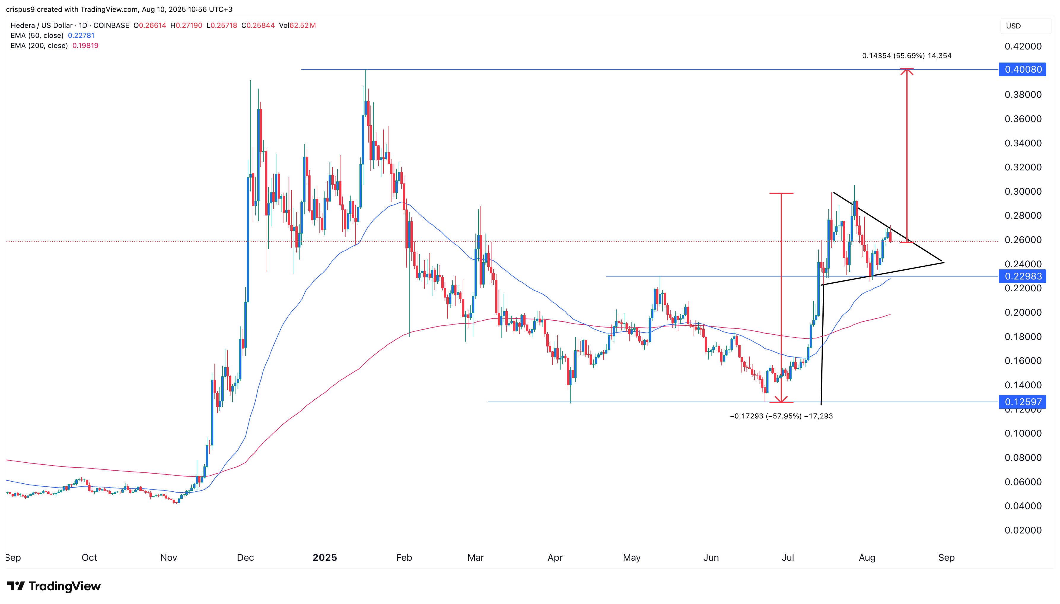 Hedera (HBAR) token rose to a high of $0.2650 on Sunday, Aug. 10, up by 16% from its lowest point this month and by 107% from the lowest level this year.