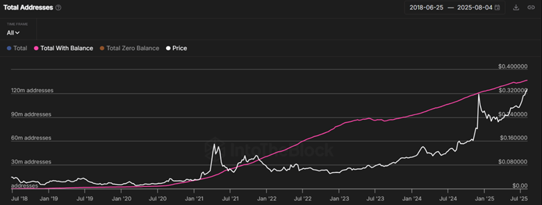Tron had a total of 136.45 million addresses with a balance as of 4 August. In comparison, there were roughly 16.44 million addresses with a balance on 12 April, 2021.