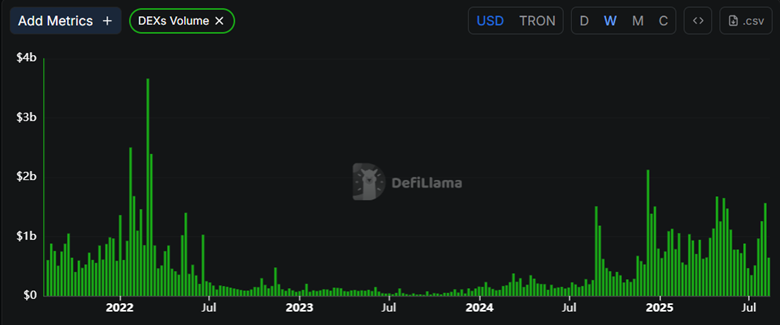 Meanwhile, Tron’ DEX performance has lagged behind but still maintained significant activity. Weekly DEX volume revealed that although there have been some surges here and there, it struggled to reach levels observed in 2021 and early 2022.