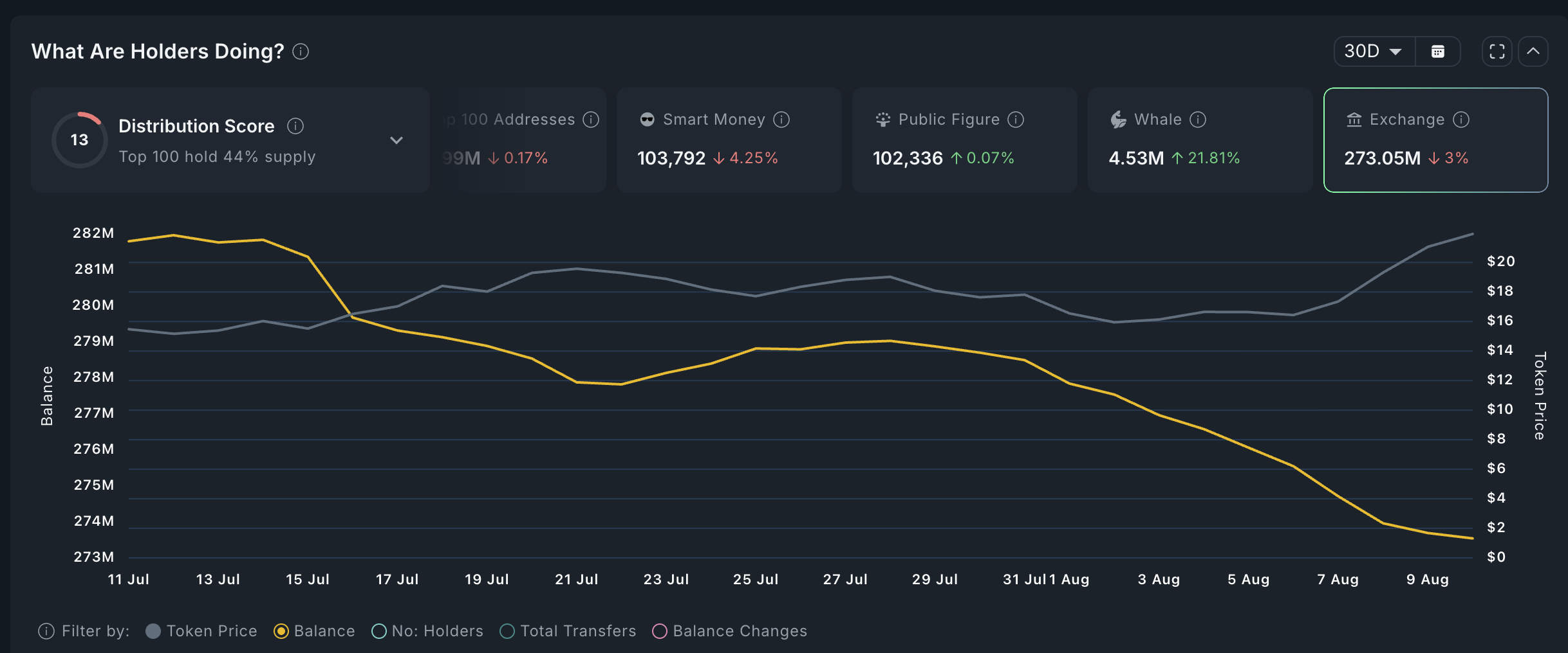 The soaring whale buying coincided with the ongoing plunging of its exchange balances. These reserves have plunged to 273 million, down from a high of 281 million last month.
