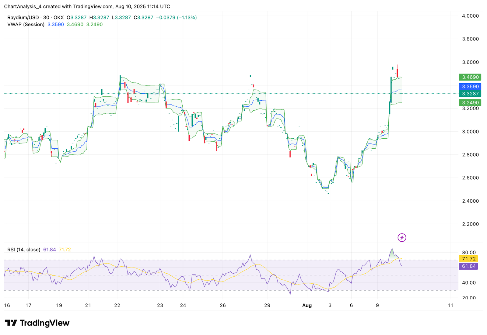 Intraday action is concentrated around the VWAP at $3.3590, which will be key for determining whether RAY can immediately retest $3.40 and attempt a breakout. The Bollinger Band upper line on the 4-hour chart at $3.4059 remains the nearest resistance, and clearing it with volume would confirm continuation toward $3.4690 and beyond.
