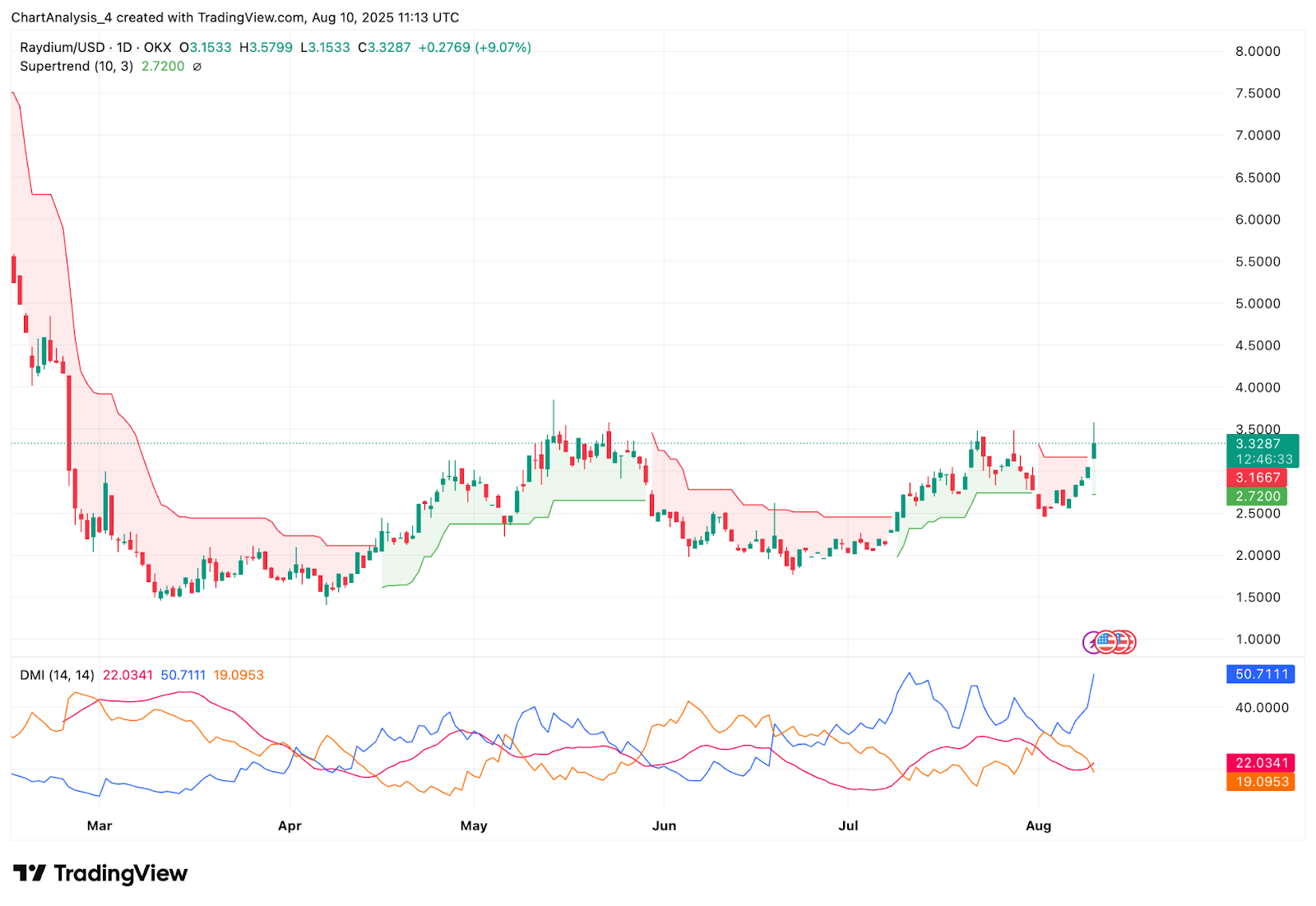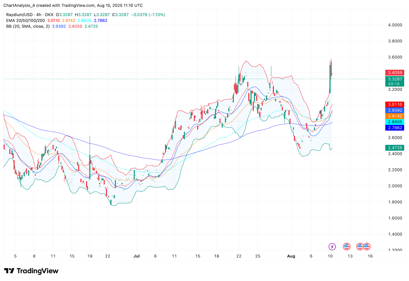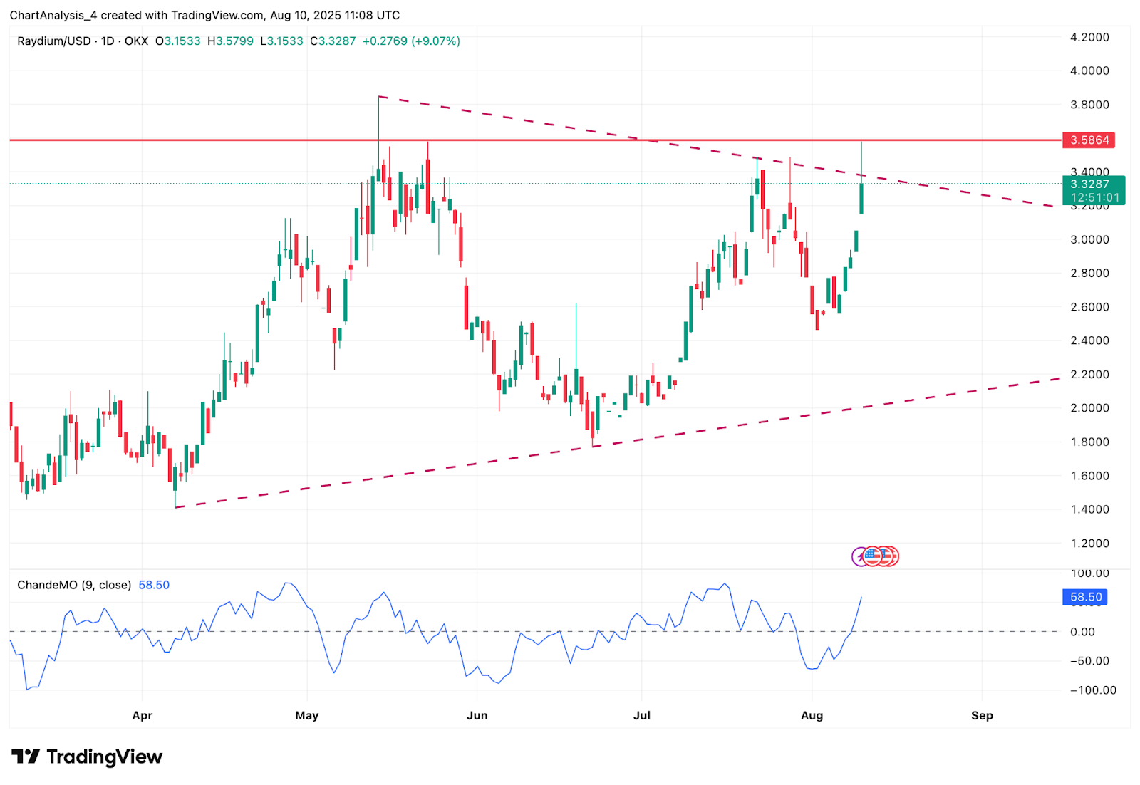 On the daily timeframe, RAY has rebounded aggressively from the $2.56 low and is now testing the descending trendline that has capped rallies since April. The Chande Momentum Oscillator reads 58.50, confirming strong upward momentum.