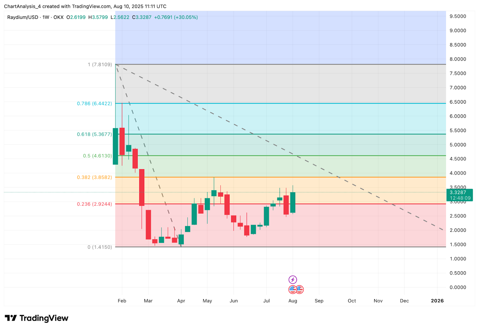 The weekly Fibonacci structure shows RAY above the 0.236 retracement at $2.9244, with the 0.382 retracement at $3.858 as the next major upside level. Clearing $3.858 would expose the 0.5 retracement at $4.6130.