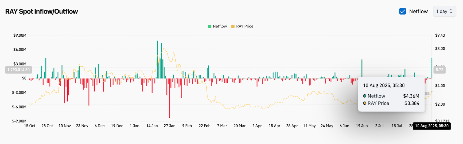 Spot inflows of $4.36M on August 10 highlight significant accumulation interest, supporting the sustainability of the breakout attempt. Net inflows in the millions suggest that institutional or large-lot traders are positioning for higher levels, making the current rally fundamentally supported by capital movement as well as chart structure.