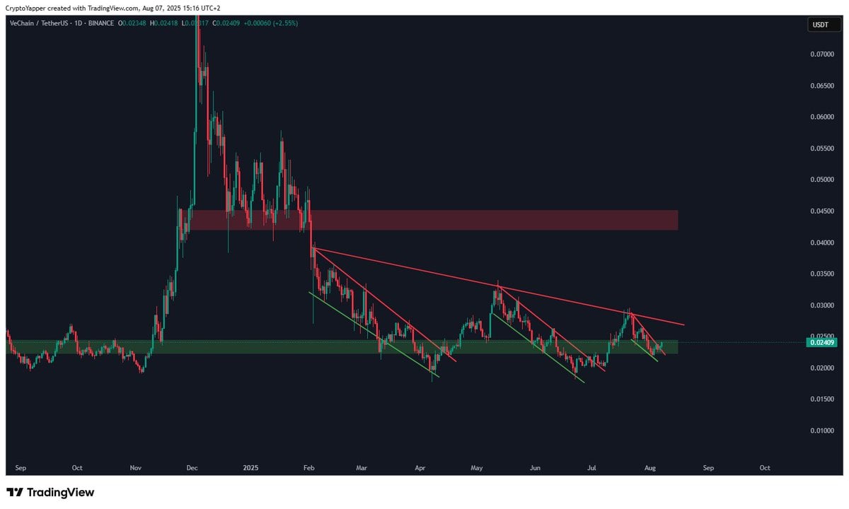 VET is still far from the all-time high of $0.27, but analysts are showing renewed optimism. A prediction platform CoinCodex predicted a near-term target for VET to reach $0.031, marking slow but steady recovery.