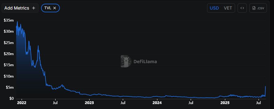 On-chain data by DeFiLlama indicate VeChain’s Total Value Locked (TVL) is now worth $5.77 million, increasing by 1.44% within 24 hours. The stablecoin market cap is valued at $287,515, while 24-hour DEX volume has touched $39,422. These metrics indicate the token’s prevalence within decentralized finance.