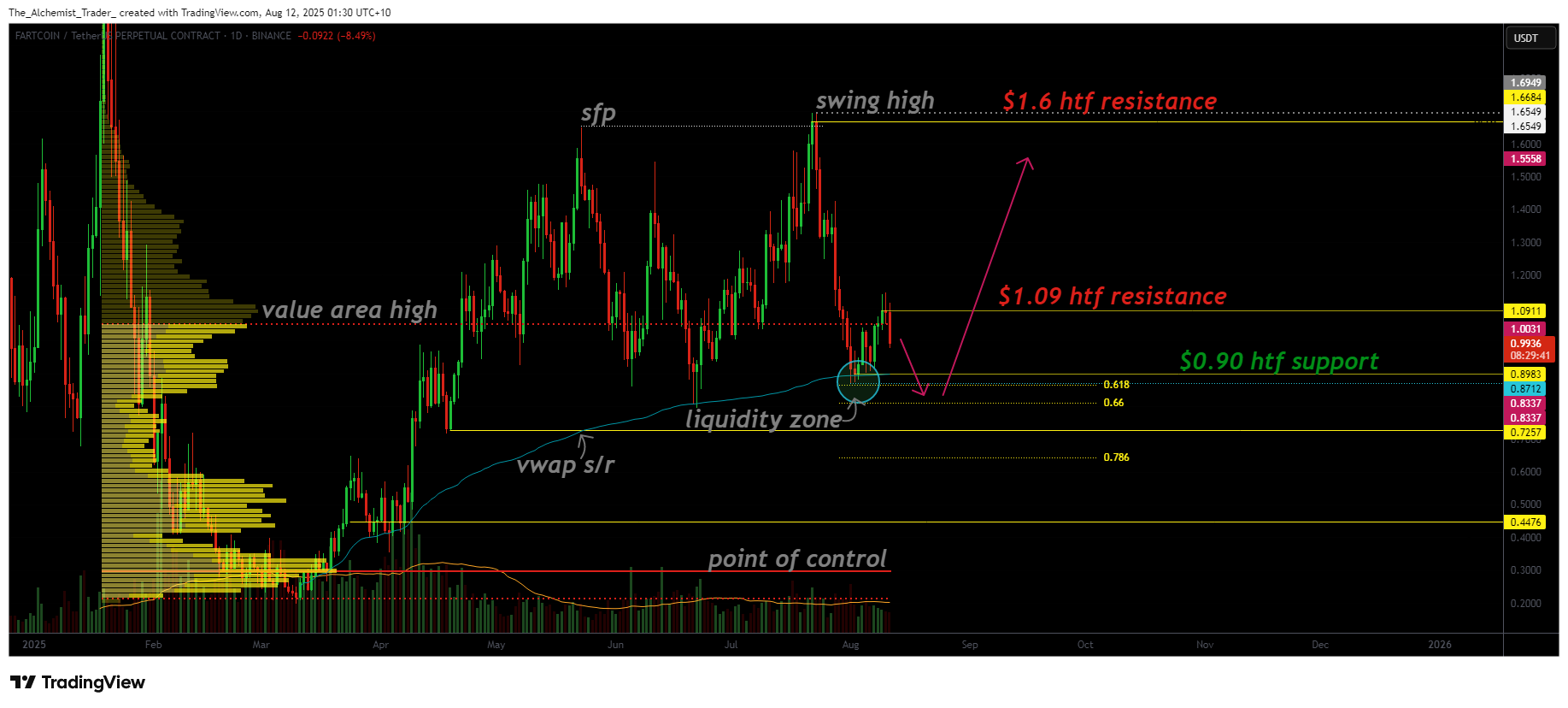 Fartcoin has dropped over 8% in the day, facing resistance at $1.09. A liquidity zone near $0.90 could provide the base for a reversal if support holds.