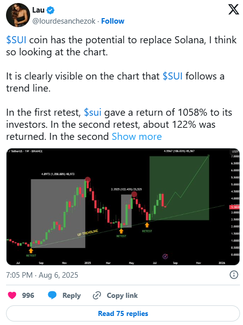 Analyst Lau highlights that past retests of SUI’s long-term trendline have delivered triple-digit gains — 1,058% in 2024 and 122% in March 2025. The current retest could pave the way toward $7.00, echoing prior expansion phases.
