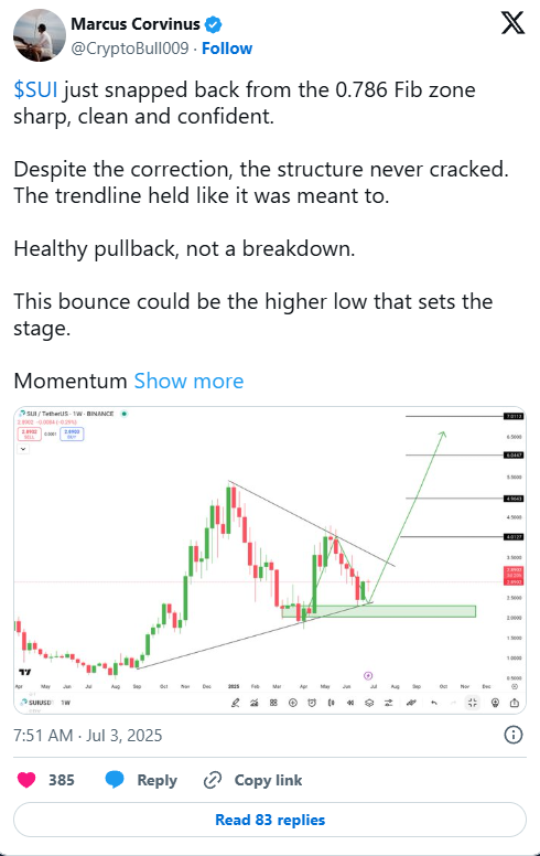 According to Marcus Corvinus, $SUI snapped back “sharp, clean and confident” from the 0.786 Fibonacci retracement.Price is respecting an ascending trendline between $2.20 and $2.60, a zone tested multiple times since September 2024. Despite weeks of selling pressure, the higher-low structure remains intact.