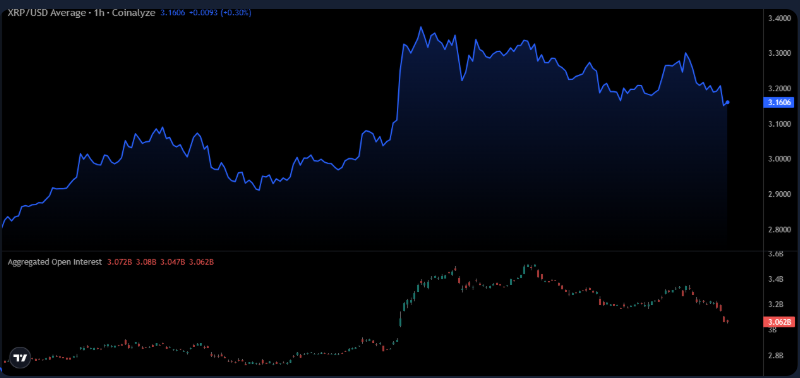 XRP is trading at $3.1606, easing from recent highs above $3.30 after a period of steady gains. Current open interest is $3.062B, down from levels near $3.6B, showing reduced speculative engagement. This alignment between falling prices and shrinking open interest suggests a moderation in market sentiment.