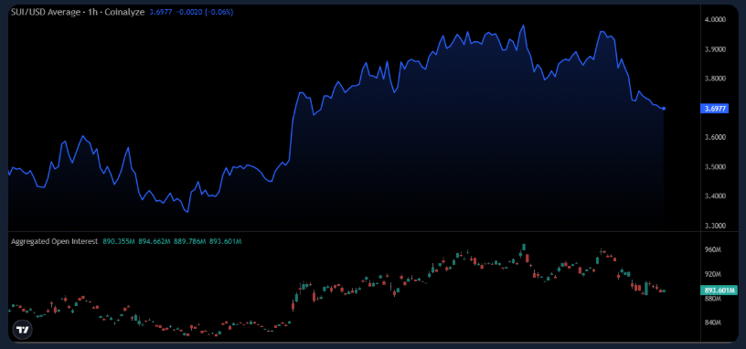 SUI has moved lower after peaking near $4.00, with the current price at $3.6977 signaling a short-term downtrend. The open interest is at $245.46M, which is lower compared to the level of $260M, which shows less leverage. This is indicative that traders are taking profits after the recent rally.
