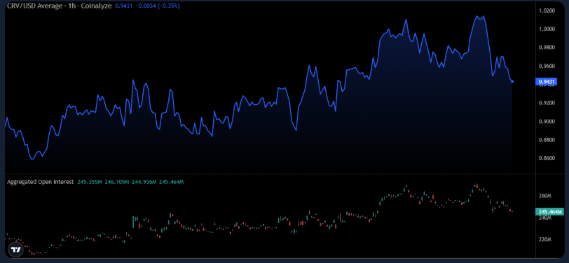 CRV is trading at $0.9431 after failing to hold above $1.02, marking a pullback from recent strength. The open interest is at $245.46M, which is lower compared to the levels of $260M which shows less leverage. This is indicative that traders are taking profits after the recent rally.
