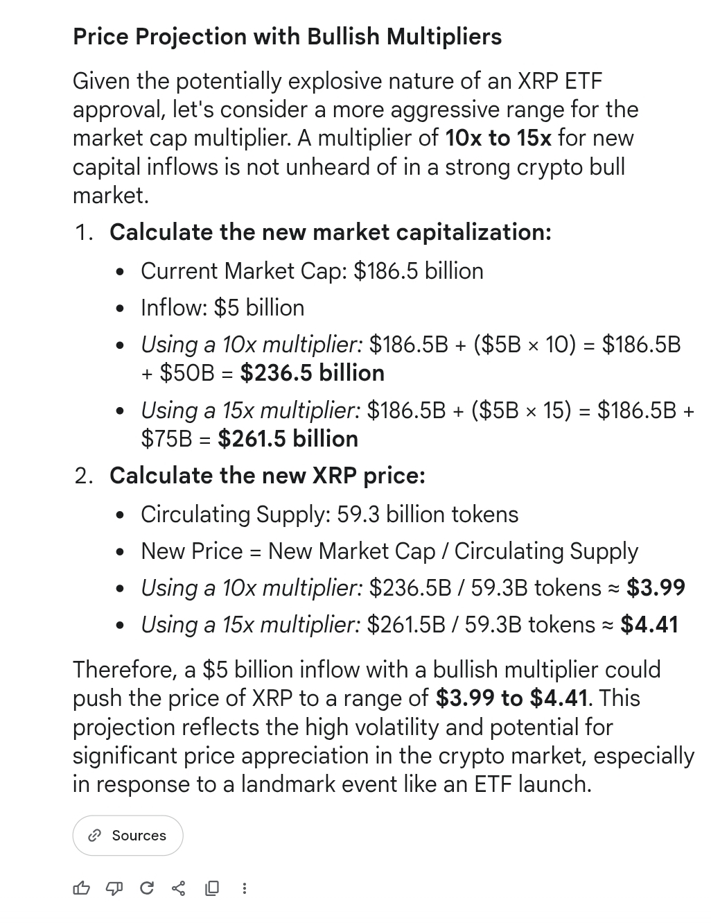 Nonetheless, it considered more modest multipliers of 10x and 15x for its evaluation. Under these assumptions, $5 billion in inflows would raise XRP’s market cap to between $236.5 billion and $261.5 billion, putting the price between $3.99 and $4.41.