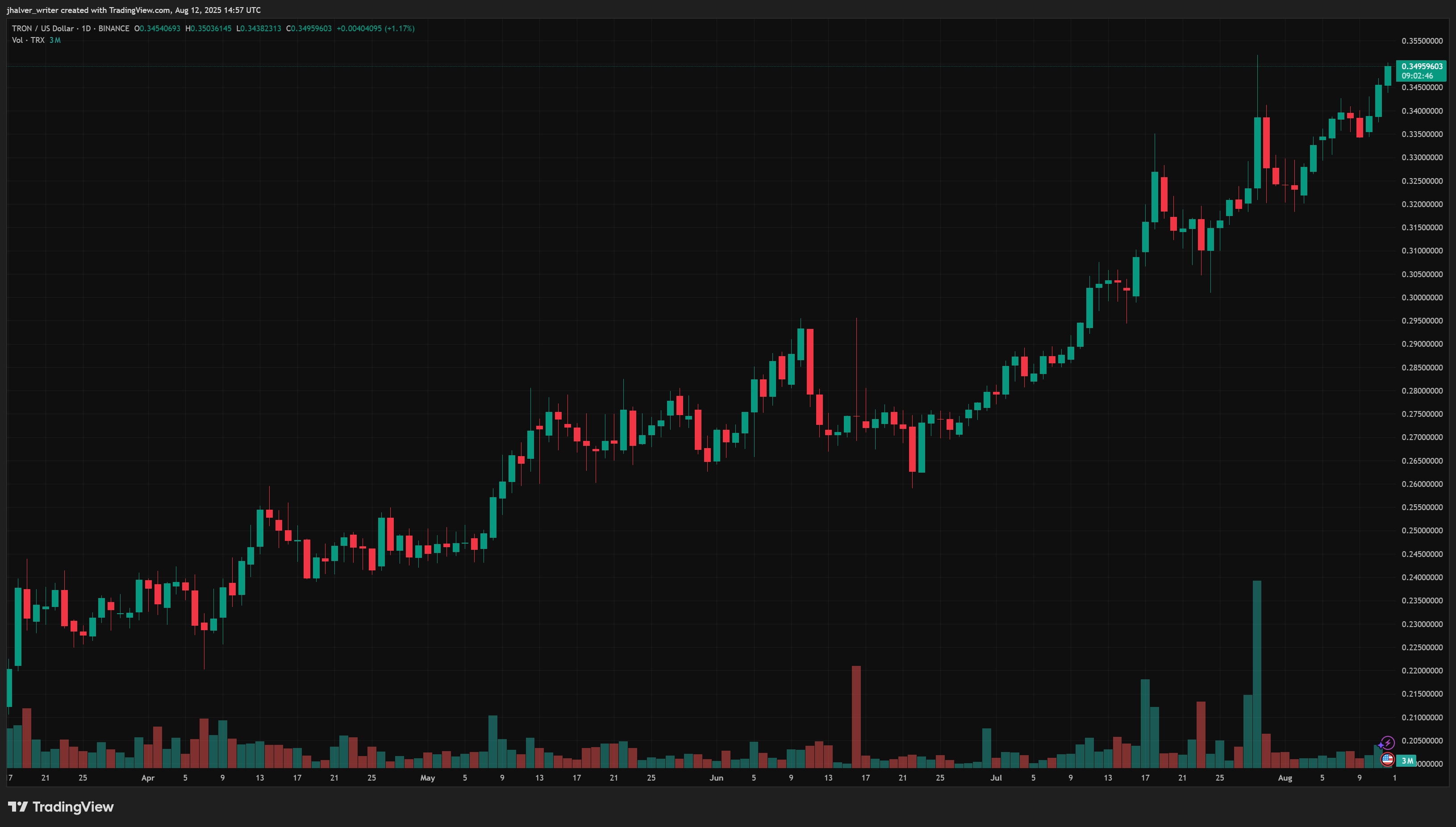 TRON (TRX) has extended its August rally, pushing past key resistance levels as trading volume soared to $1.07 billion in the past 24 hours. The price currently sits around $0.35, marking a 15.3% monthly gain and a staggering 172% surge year-over-year.