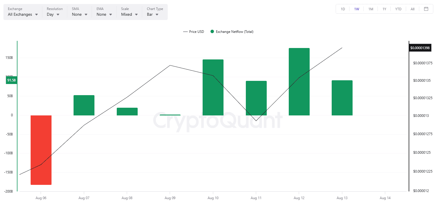 Shiba Inu’s exchange netflow has been positive in the last week, signaling that investors have switched from self-custody methods to centralized platforms. This, in turn, increases the immediate selling pressure.