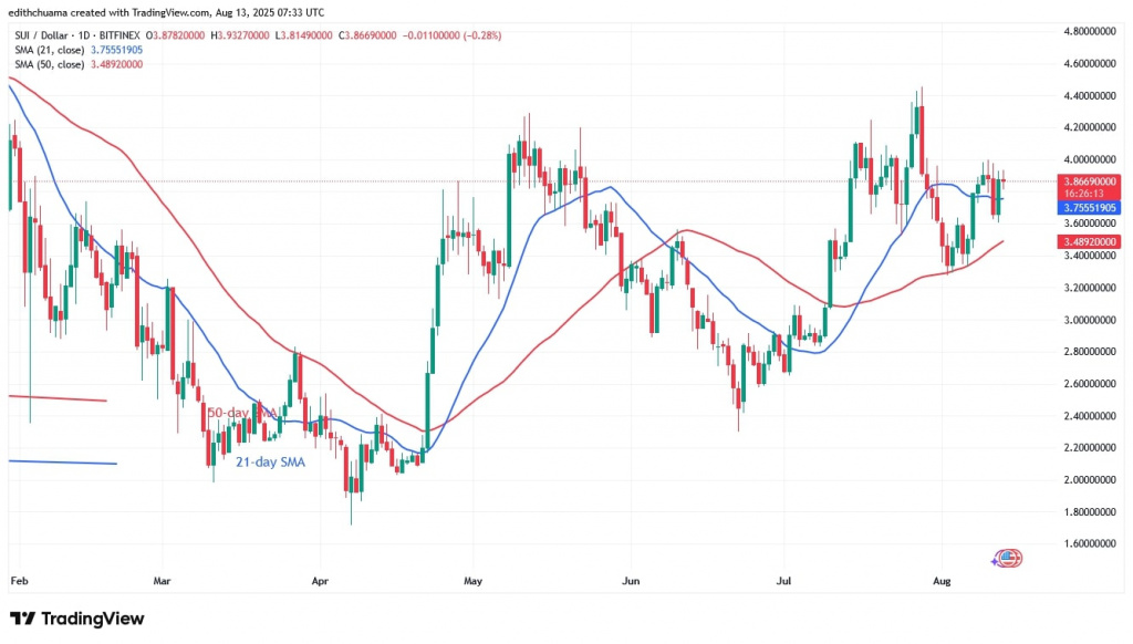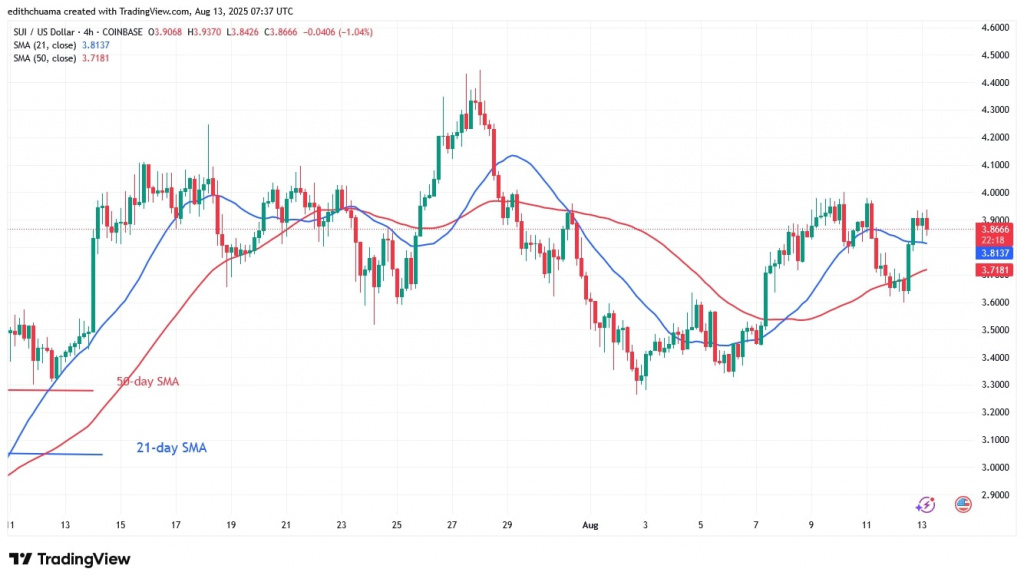 The price of Sui (SUI) has risen above the moving average lines, although it remains in a sideways trend between $3.40 and $4.40.