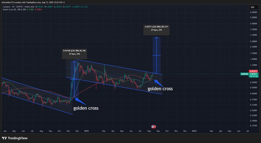 Interestingly, analyst Deezy expects ADA to reach $3, noting that Cardano has formed a “golden cross,” a bullish technical signal that occurs when the 50-day MA crosses above the 200-day MA. He noted that the last time this pattern appeared, ADA’s price surged 230%.