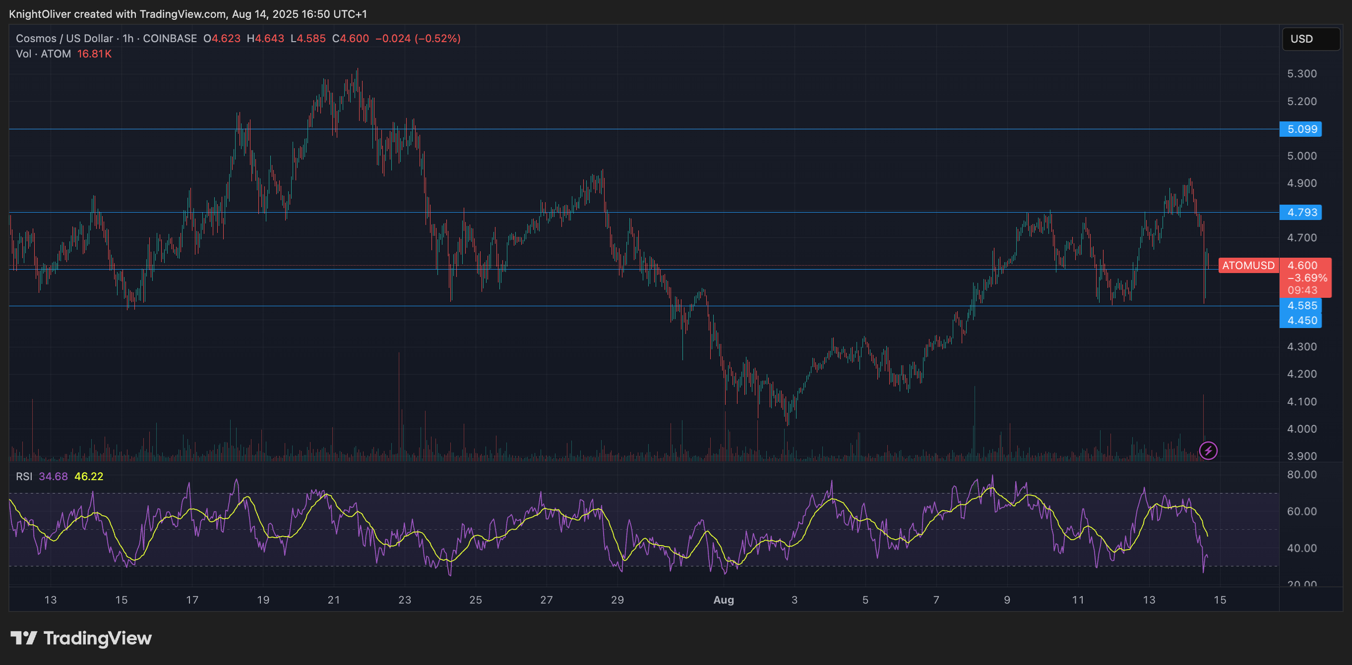 During the 60-minute recovery window from 13:20 to 14:19 on 14 August, ATOM rose from $4.60 to $4.61, peaking at $4.64 before consolidating in a tight $4.59–$4.62 range. This confirmed $4.60 as a support base, suggesting a potential launch point for future gains.