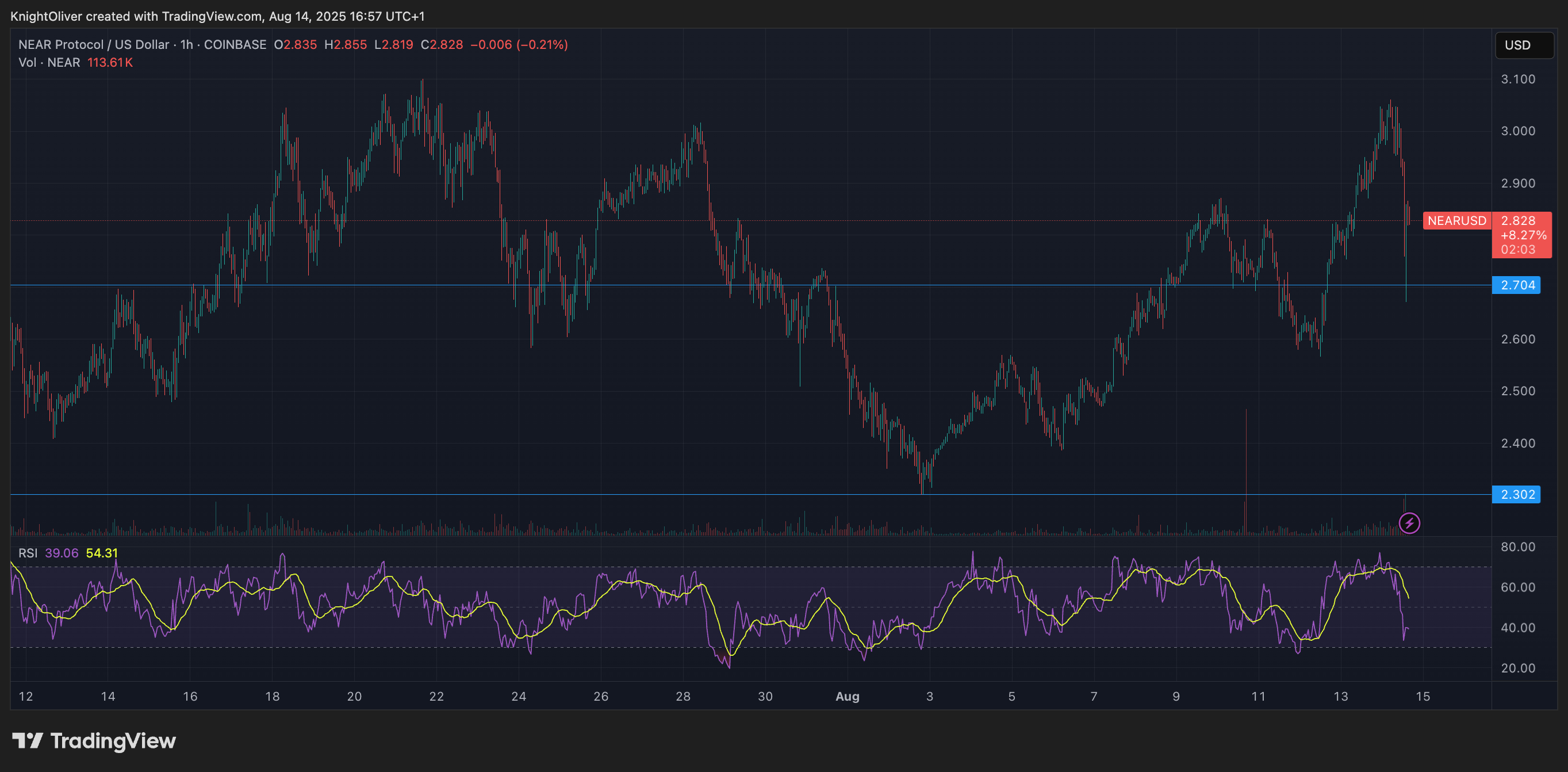 NEAR Protocol saw heightened volatility in the 24 hours ending August 14 at 14:00 UTC, with prices fluctuating between $2.78 and $3.05 before settling at $2.82.