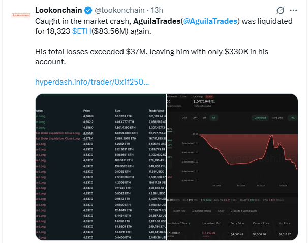 Meanwhile, the Aug. 14 market crash is said to have hit the mysterious whale Aguila Trader hard. According to Lookonchain, the trader was liquidated for 18,323 ETH ($83.56M), bringing his losses to more than $37 million and “leaving him with only $330K in his account.” This assessment was backed by another on-chain monitor on X who also revealed this to be the latest major loss for Aguila Trades.