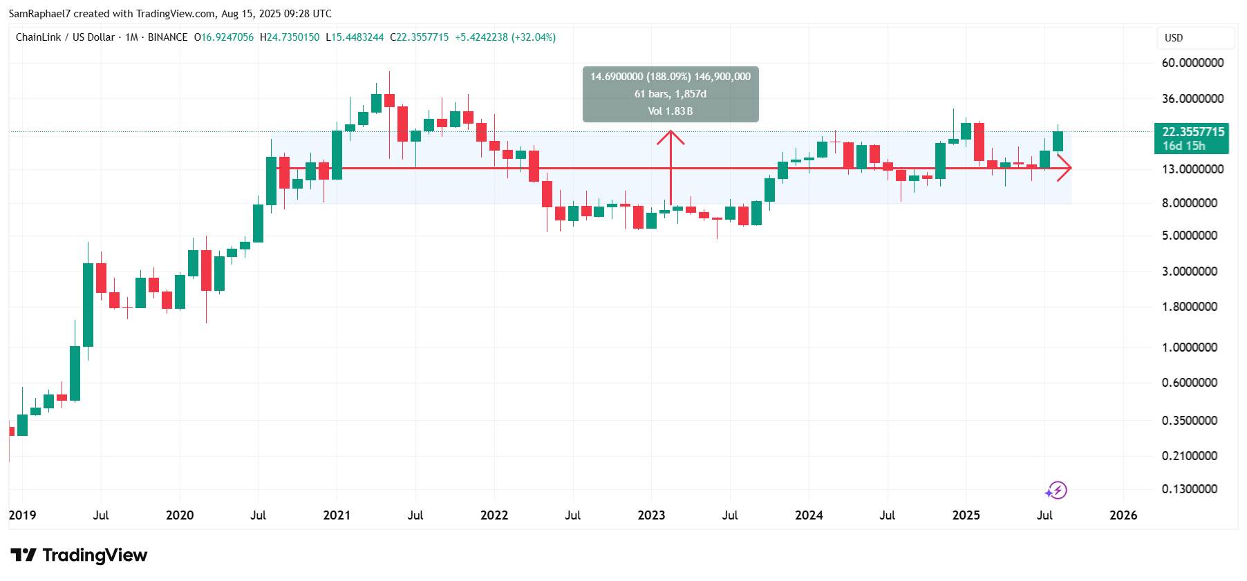 In contrast, LINK opened trading at $7.81. Now, with Chainlink’s price hovering around $22.5, it has increased 188% in the last five years. This confirms that XRP has outperformed Chainlink by nearly 6x over the past five years.