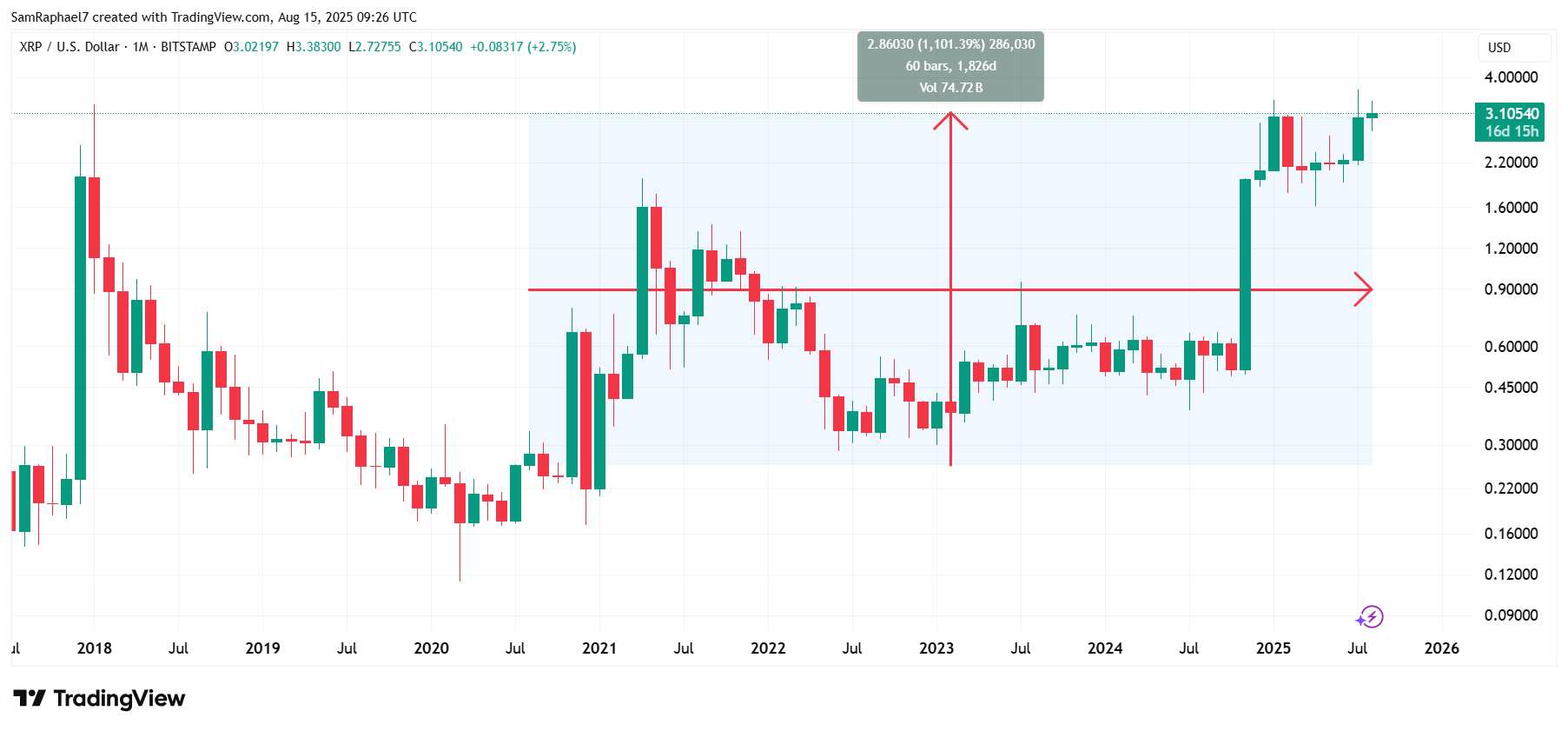 Notably, to confirm this difference in performance, we carried out independent market research. Data indicates that five years ago, in August 2020, XRP opened trading at $0.2597. Today, with its price standing at $3.12, XRP has gained by an impressive 1,101% over the past five years.