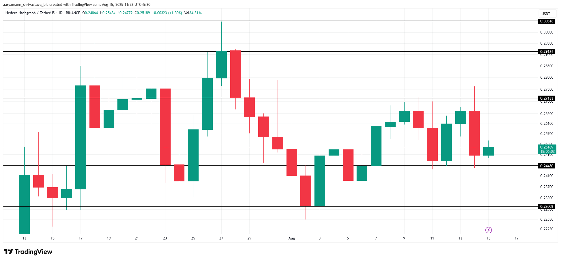 HBAR has been experiencing sideways movement recently, remaining rangebound between $0.244 and $0.271.