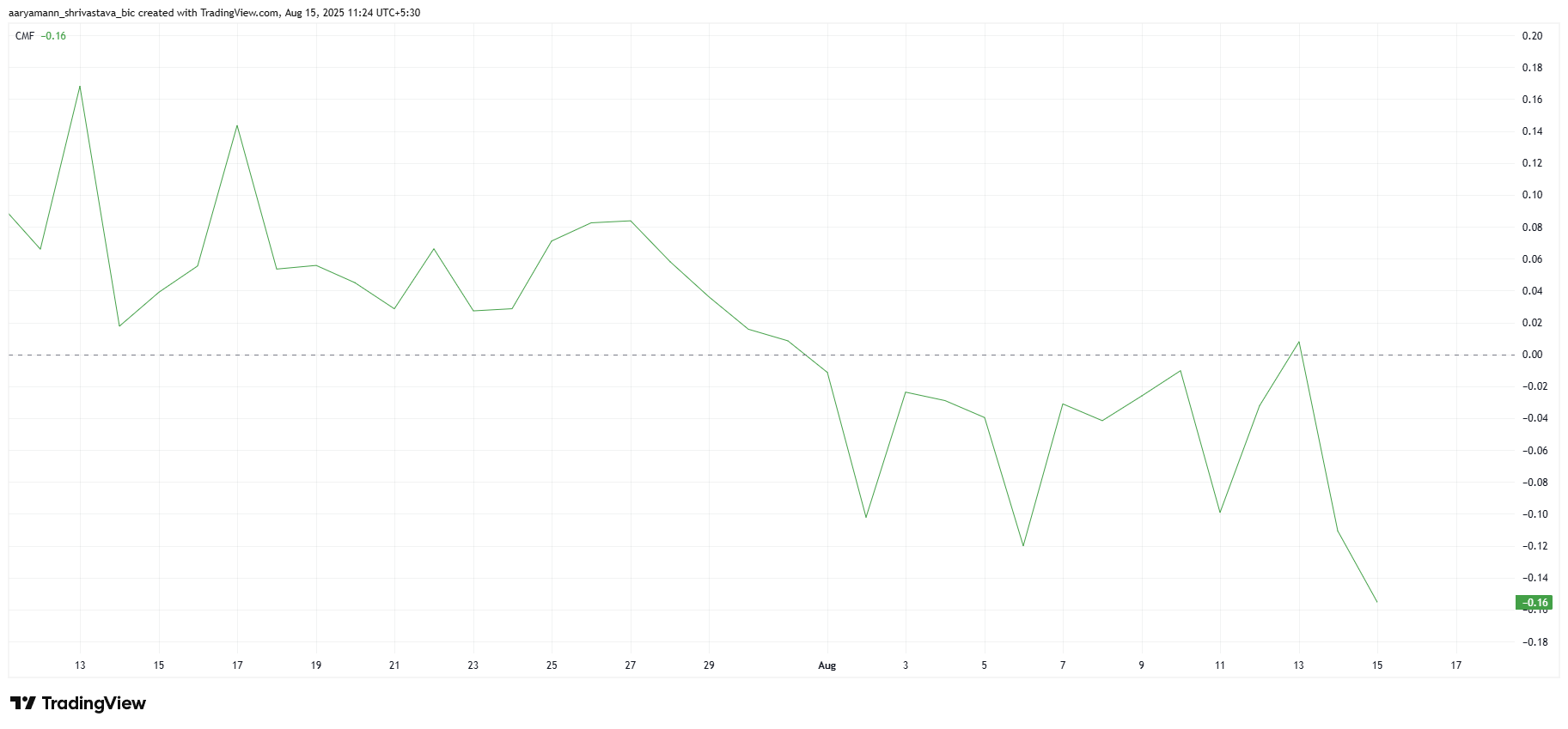 The Chaikin Money Flow (CMF) indicator shows that investor sentiment toward HBAR is currently bearish. The CMF has reached a two-month low, signaling that outflows are dominating the asset. This decline in the CMF suggests that many HBAR holders are selling their positions as the price consolidates, pushing investors to secure their gains.