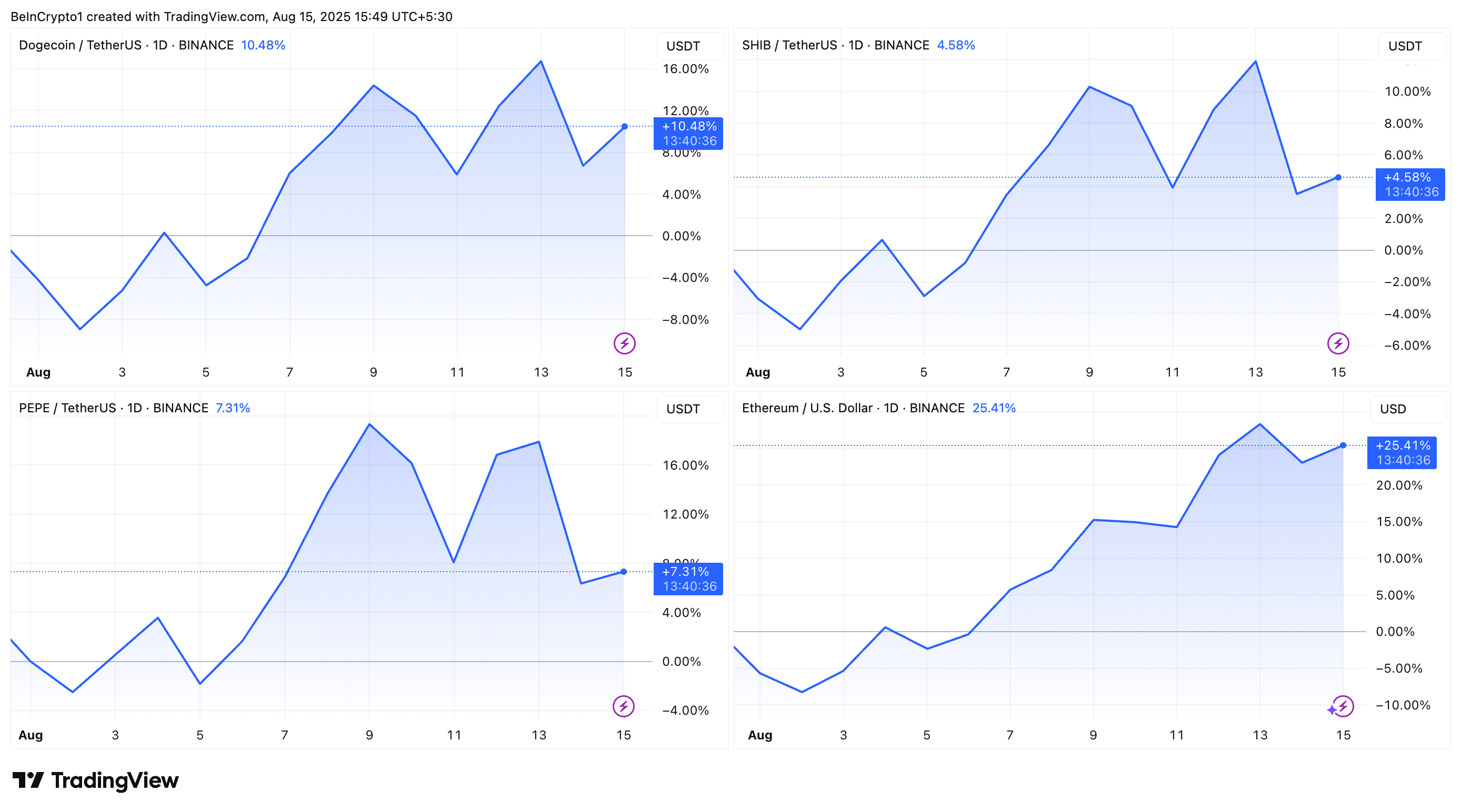 So far this month, Ethereum has recorded a 25.41% increase. Meanwhile, Dogecoin (DOGE) has risen by 10.48%, Shiba Inu (SHIB) by 4.58%, and Pepe (PEPE) by 7.31%.