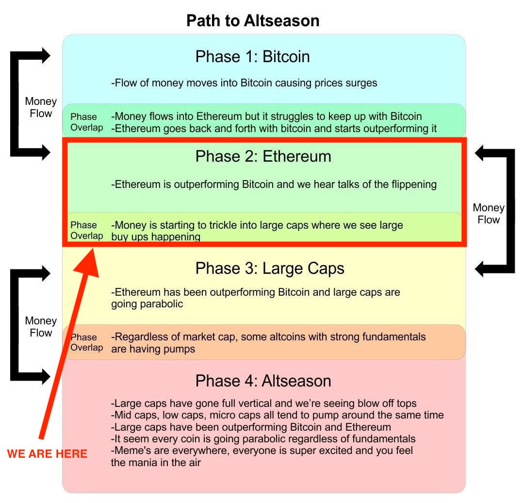 This will be followed by Phase 3, during which Ethereum continues to outperform Bitcoin and large-cap altcoins start to experience significant growth.