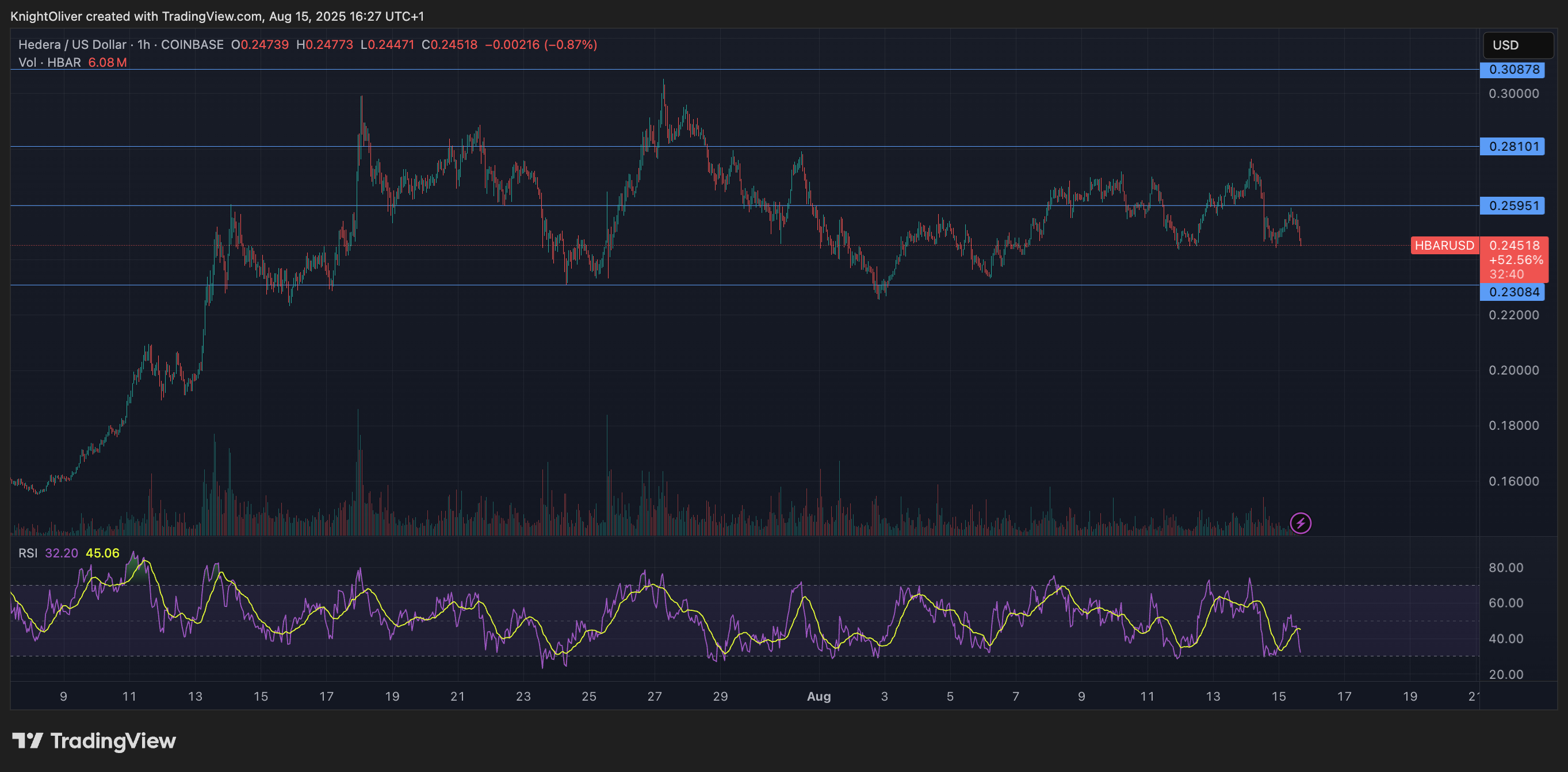 HBAR posted sharp price swings over the 24 hours between Aug. 14 at 15:00 and Aug. 15 at 14:00, moving within a $0.015 range, a 6% gap between the day’s high of $0.259 and low of $0.244.