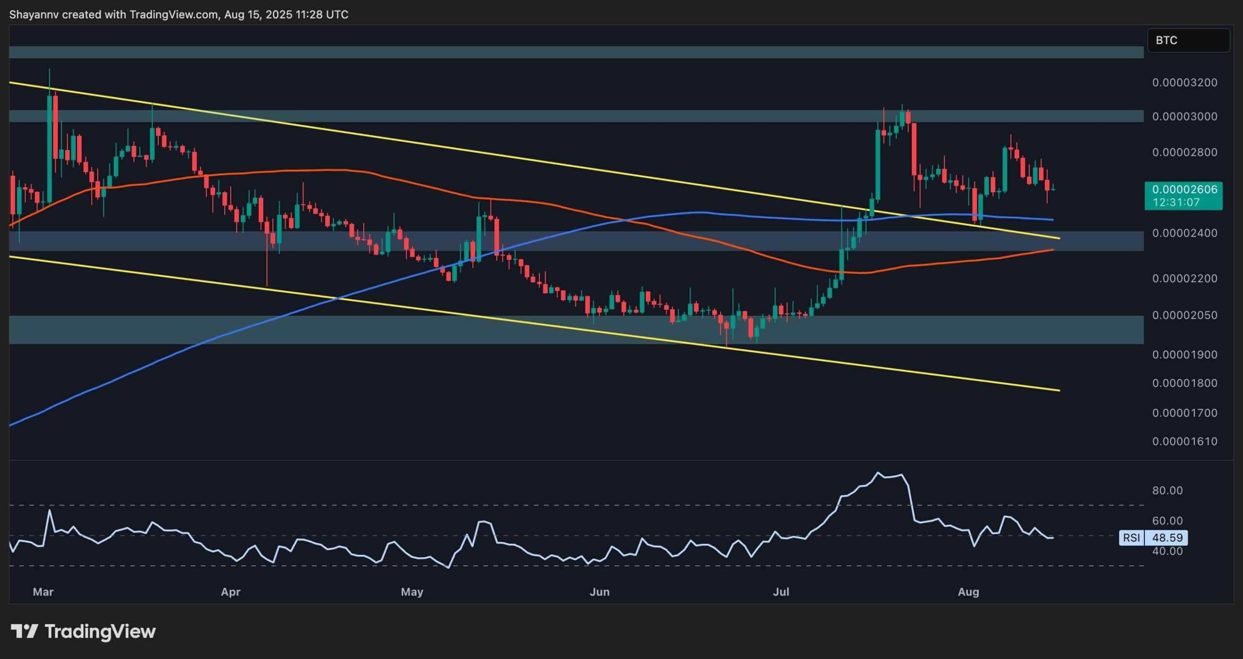 That said, RSI levels around 48 show that momentum has cooled after the sharp July rally, meaning XRP may continue ranging between 2,400 SAT and 3,000 SAT in the near term. A decisive close above 3,000 SAT would likely open the path to the 3,400 SAT zone, while losing 2,400 SAT could shift the bias back toward 2,000 SAT support. For now, the structure still favors the bulls as long as higher lows remain intact.