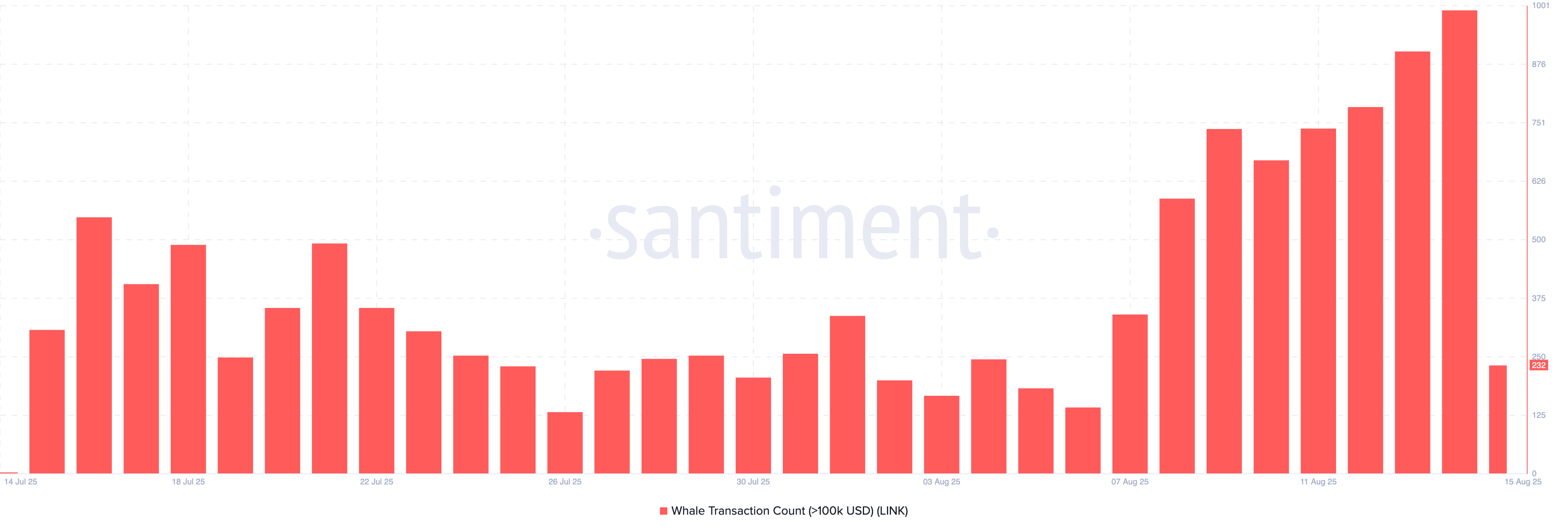 On-chain data has shown that the count of LINK whale transactions exceeding $100,000 soared to a seven-month high of 992 on Thursday.