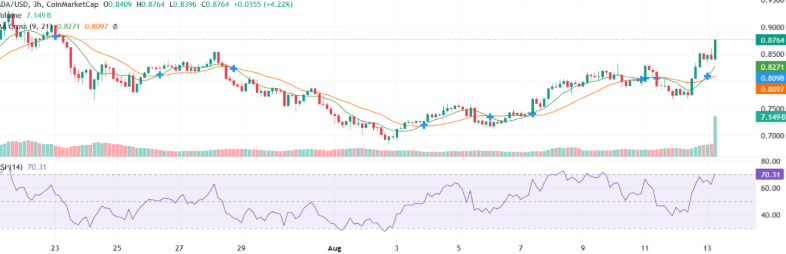 Cardano is holding its bullish stance as a golden cross pattern extends on its three-hour chart, pushing ADA closer to the one-dollar mark. The cryptocurrency is currently trading at $0.87, marking a 12.6 percent increase in the last 24 hours. Earlier today, the price touched $0.88 before retreating slightly to its present level.