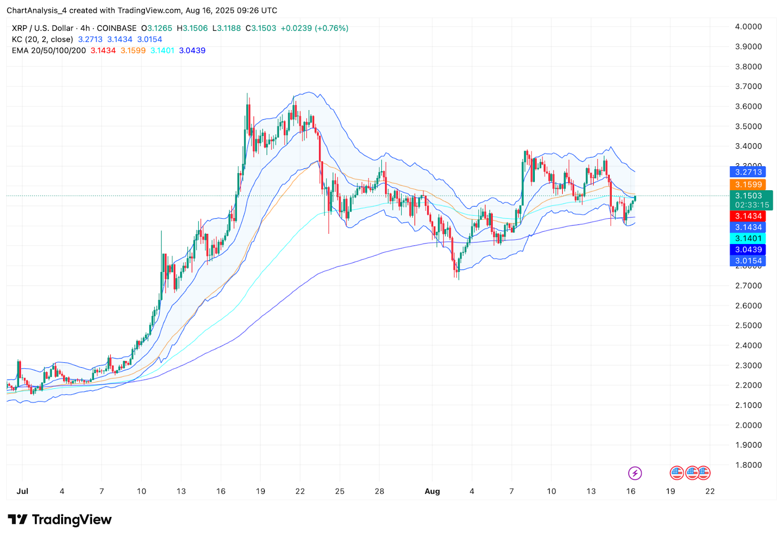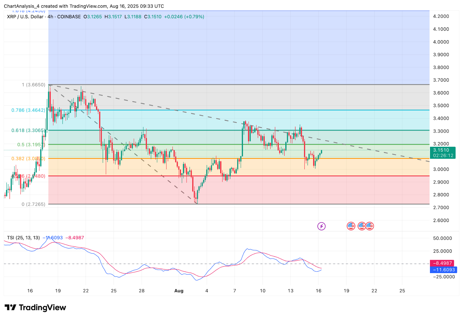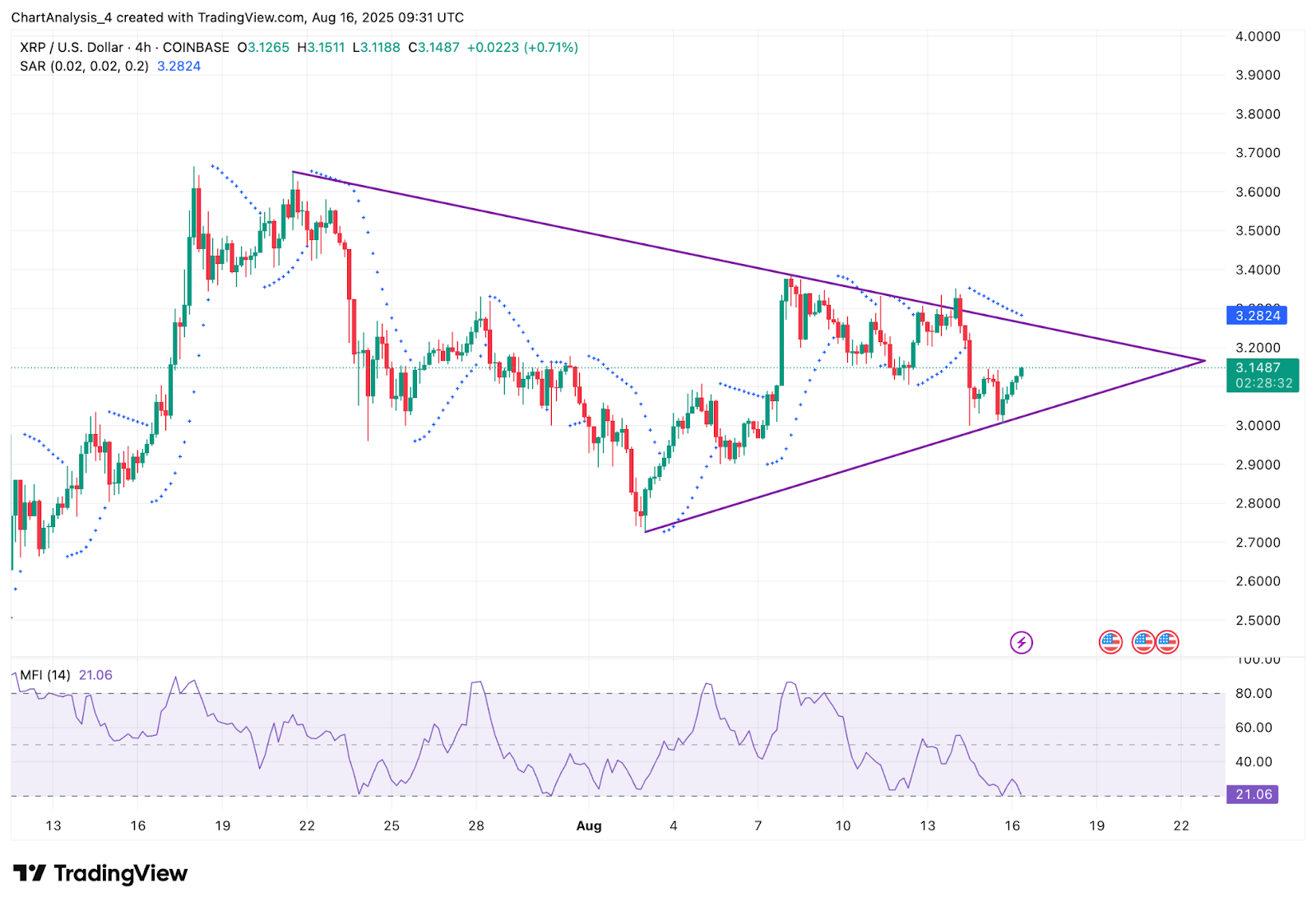 Meanwhile, the True Strength Index remains in negative territory at -11.6, suggesting momentum is still subdued. Yet the Parabolic SAR on the 4-hour chart is nearing a bullish flip if price closes above $3.20. Together, these indicators reinforce that XRP is in a compression phase, awaiting breakout confirmation.