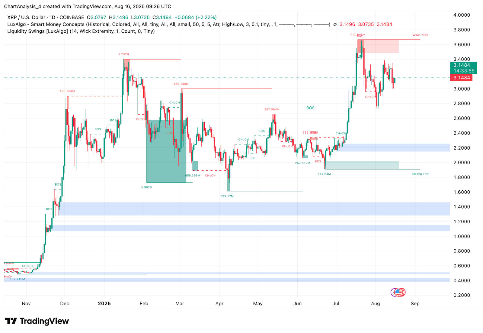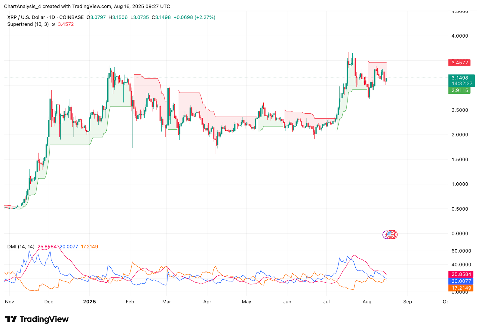 For August 17, XRP’s outlook hinges on whether bulls can defend the $3.10 base. Holding this zone could see a push toward $3.20–$3.28, with $3.30 as the breakout trigger. A decisive close above $3.30 would likely target $3.46 and potentially $3.60 again.